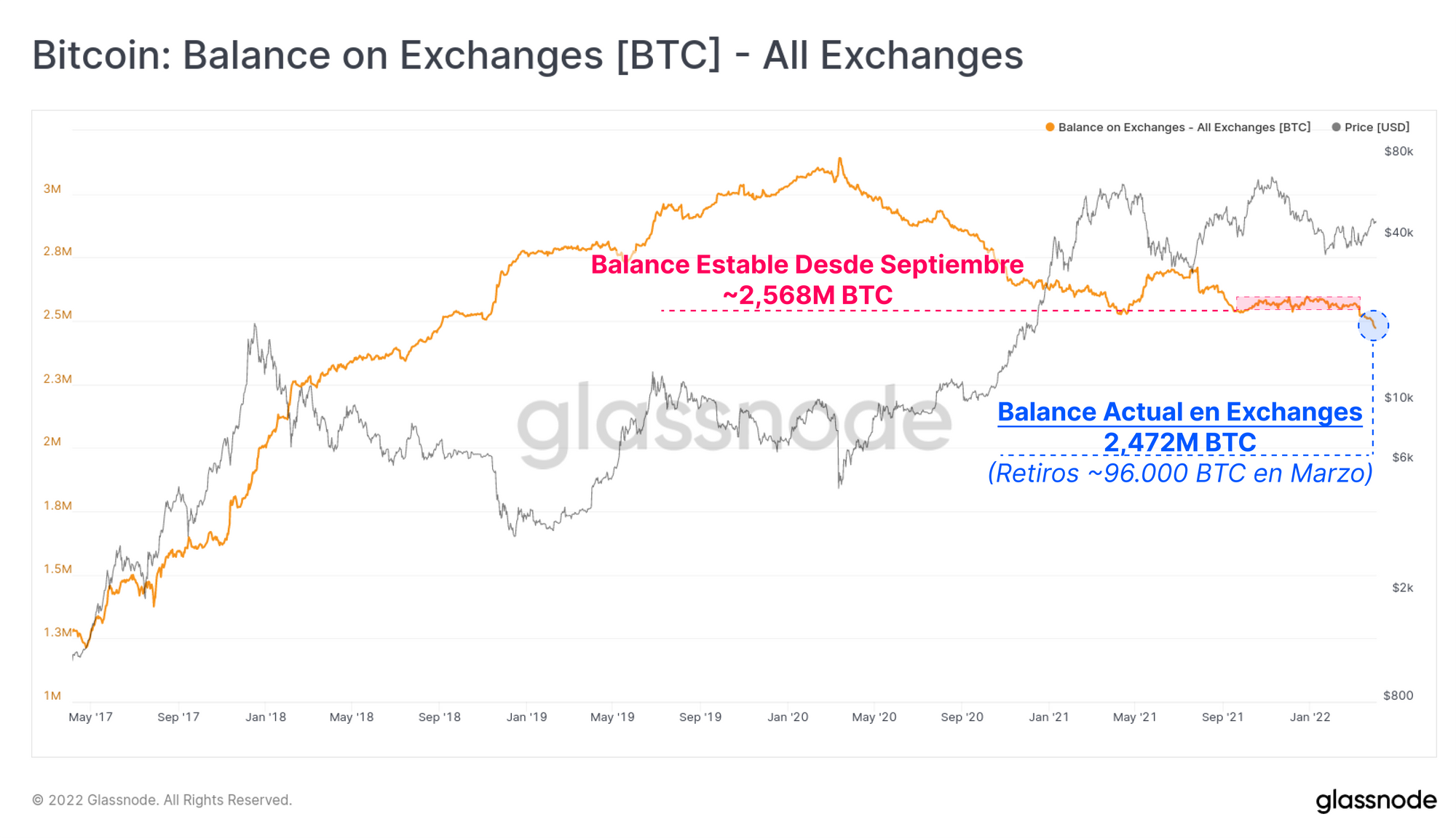 El impacto de unos retiros tan sostenidos en el tiempo, y de tal magnitud, es que el balance en las arcas de los exchanges ha caído a mínimos multi-anuales. Durante el transcurso del mes de marzo, más de 96.000 BTC han escapado de los exchanges a los que les seguimos la pista, alcanzando unos valores que no veíamos desde agosto del 2018. Hay que tener en cuenta que esto en sí representa una importante rotura bajista de la anterior tendencia generalmente estable, que arrancó en septiembre del pasado 2021.