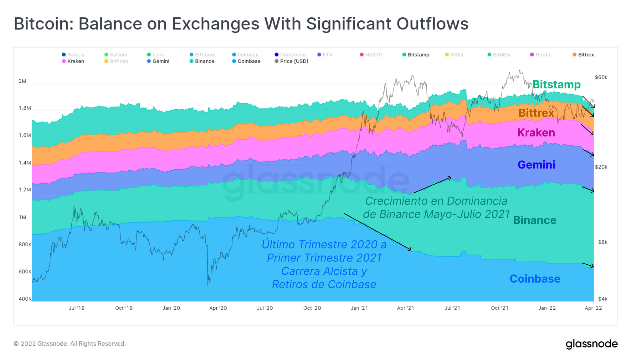 Si ojeamos de cerca qué exchanges son específicamente, observamos que la mayoría de retiros se originan desde los mayores exchanges de la industria. Coinbase, Binance, Gemini, Kraken, Bittrex y Bitstamp últimamente están experimentando retiros netos muy significativos, a pesar de que muchos de ellos han aumentado el tamaño de sus arcas enormemente en los últimos 12 a 24 meses. Binance particularmente, que vio cómo explotaba al alza la dominancia de su balance monetario en el 2021, ha sufrido retiros netos por valor de 20.800 BTC en las últimas 2 semanas.