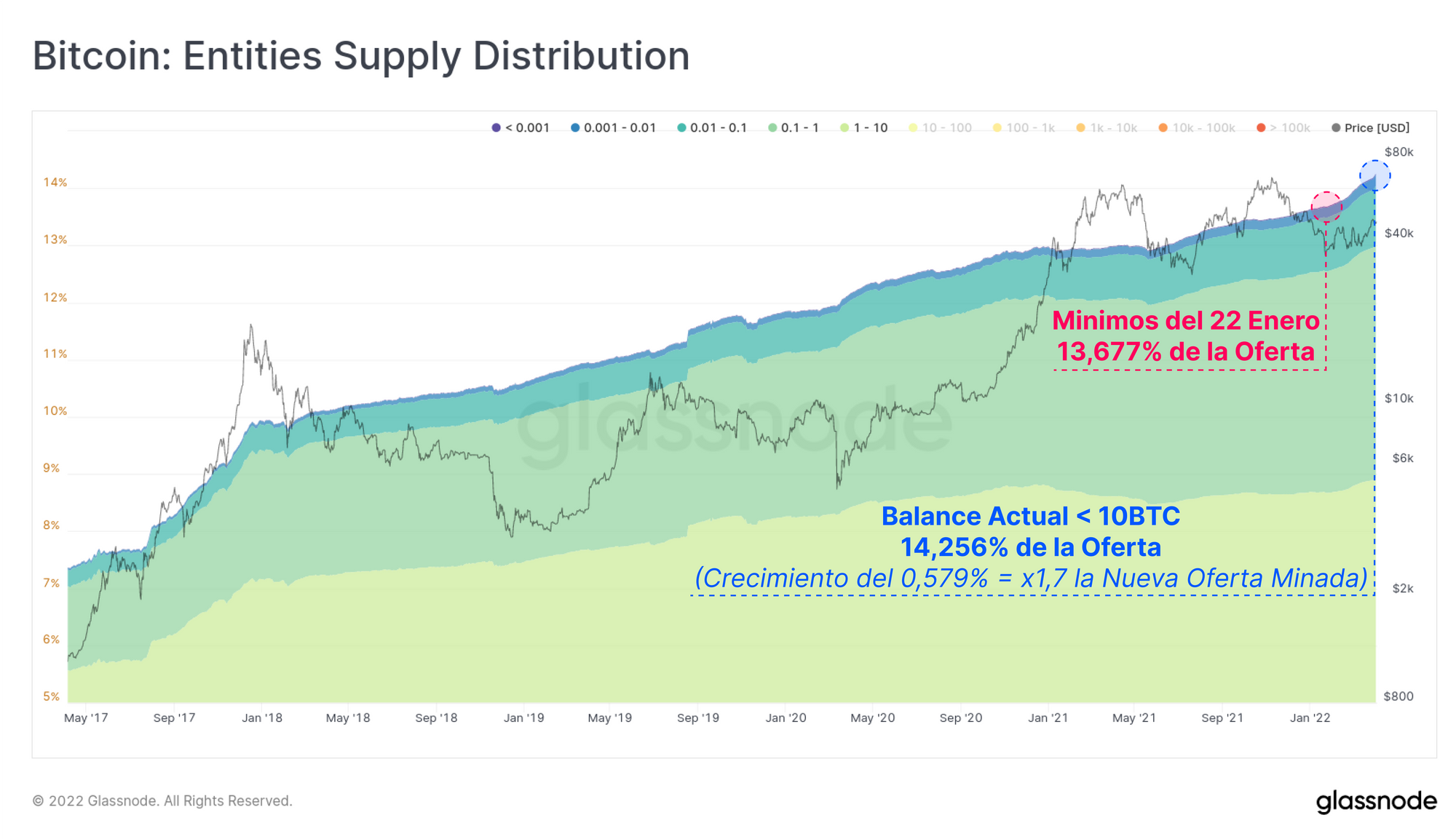La utilización y percepción de Bitcoin como colateral financiero está en tendencia positiva, y sigue aumentando con cada nueva aplicación y uso que se le da. La Luna Foundation Guard (LFG) ha encabezado la fuerza compradora de esta semana, y su clara intención es utilizar ese BTC acumulado para respaldar el algoritmo de la moneda estable UST. Además, se han añadido fondos al WBTC, los ETFs canadienses, y la acumulación generalizada ha estado siendo también históricamente pronunciada, especialmente tras el mínimo local que imprimió el precio el 22 de enero.