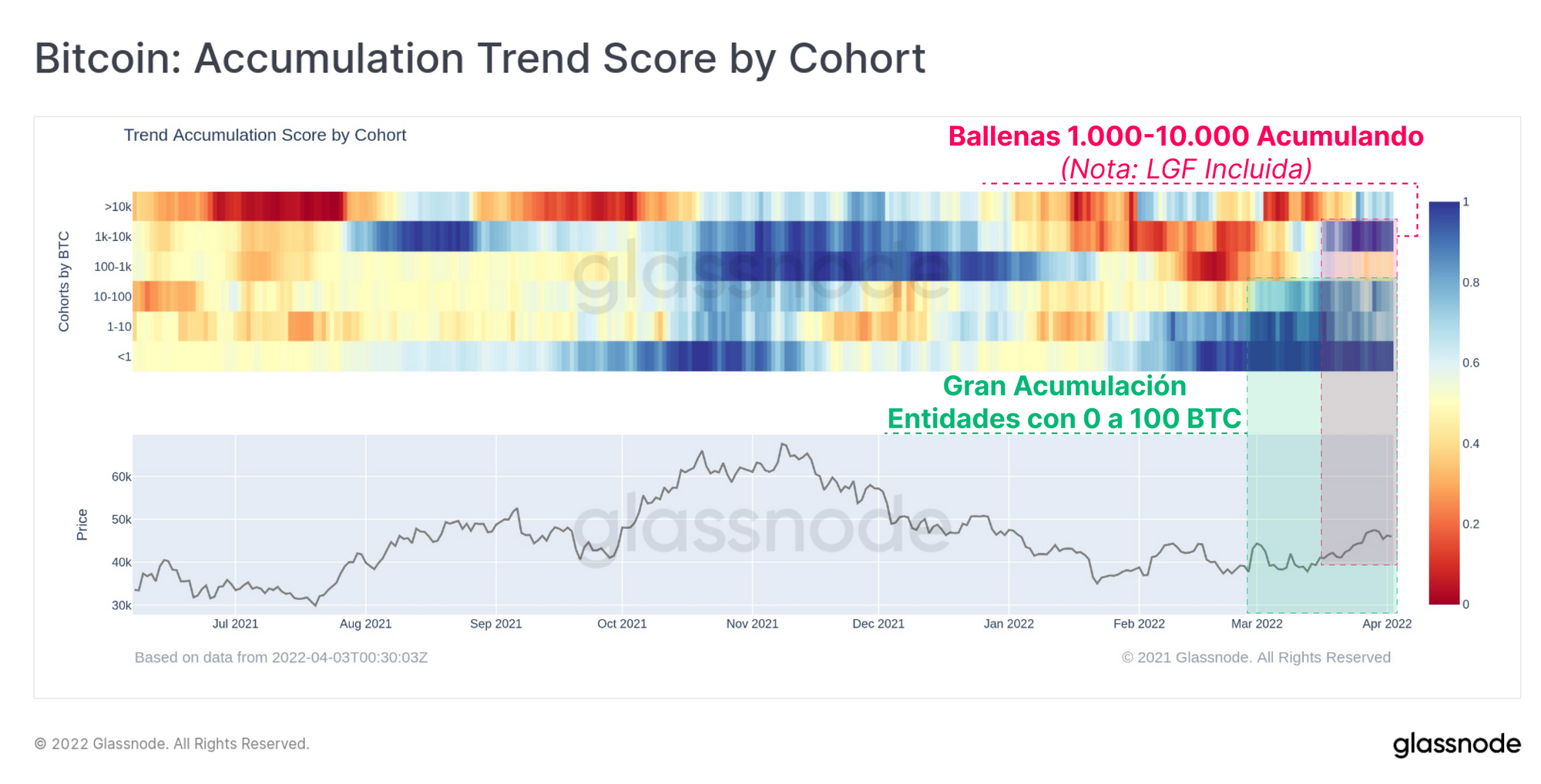 Podemos observar también que el grupo con carteras entre 100 y 1.000 BTC son las que menos han contribuido en esta acumulación general (zona roja), mientras que el grupo de las Ballenas (>1.000 BTC) se ha puesto seriamente a acumular en estas últimas dos semanas. Incluye a entidades como la LFG, de la cual hablaremos en más detalle en la siguiente sección.