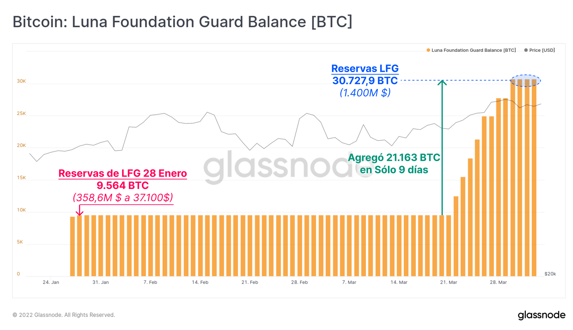 Ya sabemos que un enorme volumen de BTC está siendo acumulado por entidades Ballenas (> 1.000 BTC) a lo largo de las dos últimas semanas. Una de las entidades públicas ha sido la Luna Fundation Guard (LFG), quien amasa un tesoro de 30.727 BTC en estos momentos. Su primera compra se efectuó a finales de enero con un importe de 9.564 BTC, valorados en 358,6M $ en aquel momento, el balance de la LFG ha crecido ahora en 21.163 BTC adicionales en un corto periodo de 9 días. El valor acumulado en el balance de la LFG supera ya los 1.400M $.
