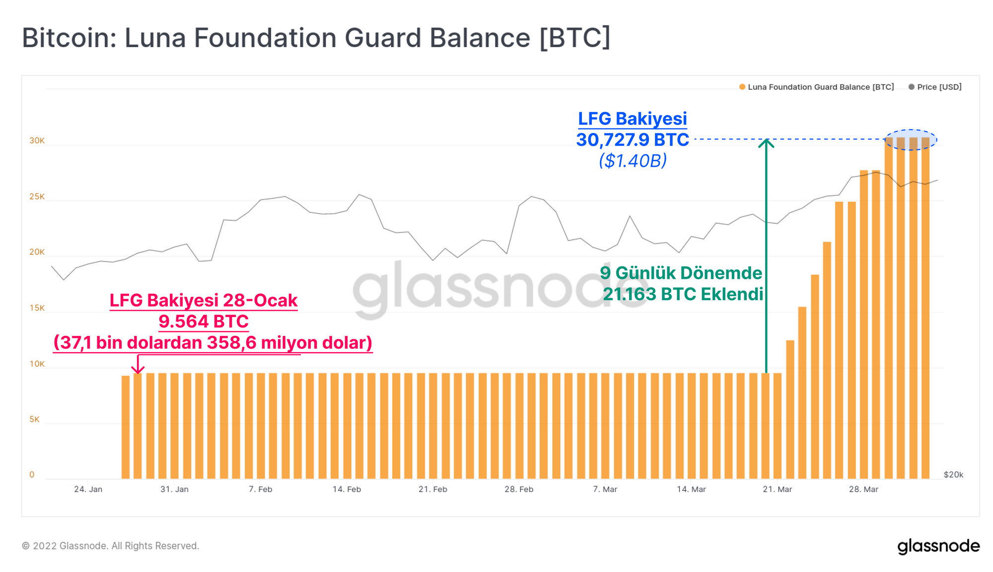 - Luna Foundation Guard tarafından büyük ölçekli birikim, son 9 gün içinde toplam holdinglerde 21.163 BTC artışla gerçekleşti. Ek olarak, Ethereum (WBTC) üzerindeki toplam sarılmış Bitcoin arzı, DeFi ürünlerinde teminat olarak BTC'ye sürekli bir talep göstererek 12,5 bin BTC arttı.