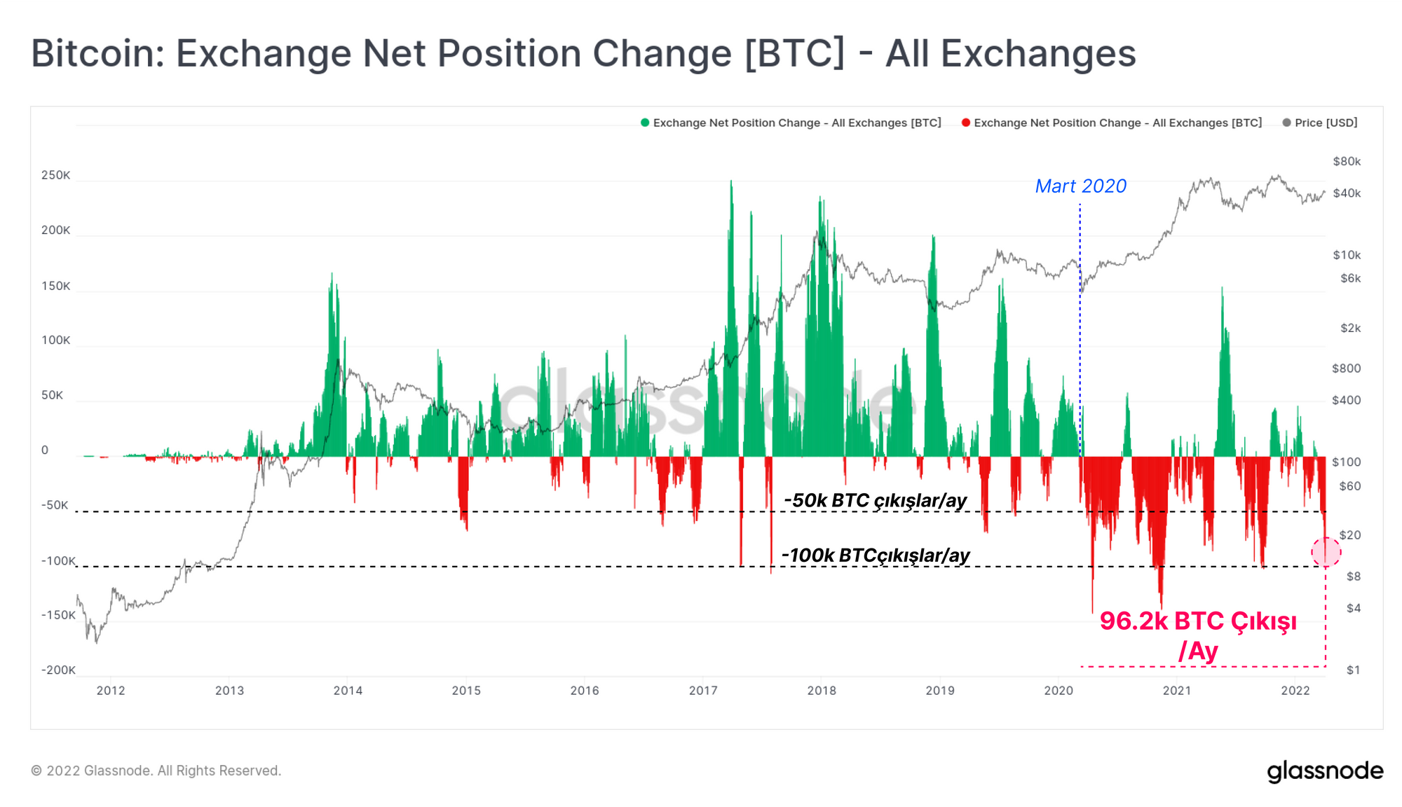 - Borsalar, toplam bakiyelerinin birkaç yılın en düşük seviyelerine ulaşmasıyla birlikte önemli net kripto para çıkışları görmeye devam ediyor. BTC, borsalardan ayda 96 bin BTC'nin üzerinde bir oranda çıkıyor ve tarihsel olarak güçlü bir birikimin gerçekleştiğine işaret ediyor.