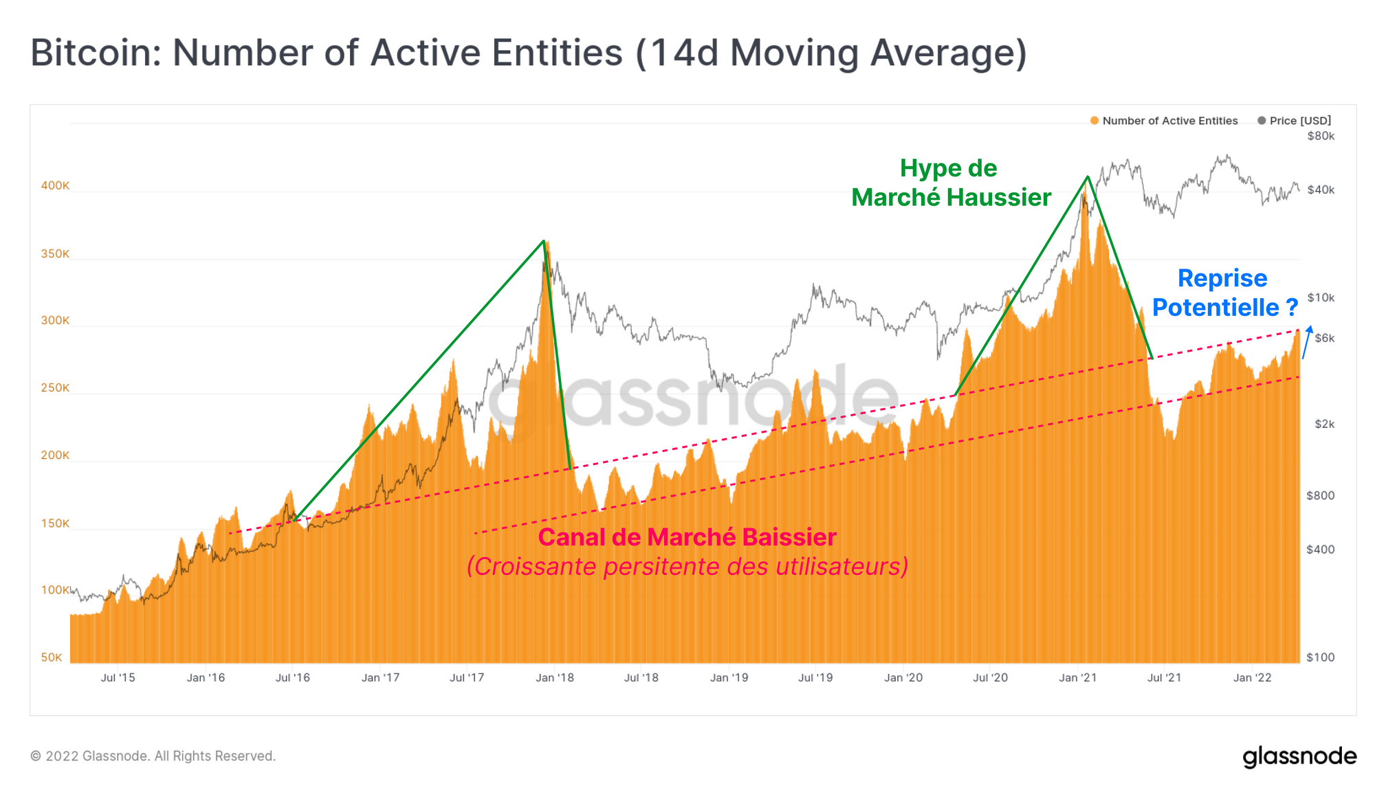 Le nombre d'entités actives (analogue aux utilisateurs actifs quotidiens) reste dans le canal du marché baissier qui a été établi au cours des six dernières années. Cela dit, le nombre actuel d'entités actives (296 000/jour) se situe à l'extrémité supérieure de ce canal, et une expansion soutenue à la hausse serait constructive.