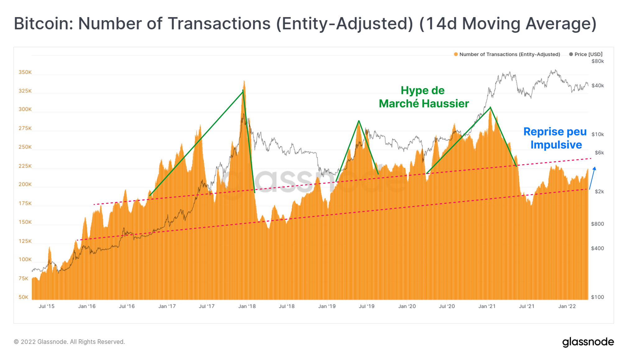 Un ensemble d'outils puissants permettant de suivre la nature cyclique des tendance du bitcoin est l'activité on-chain, décrite de manière générale comme l'utilisation de l'espace de bloc par les participants actifs du réseau.