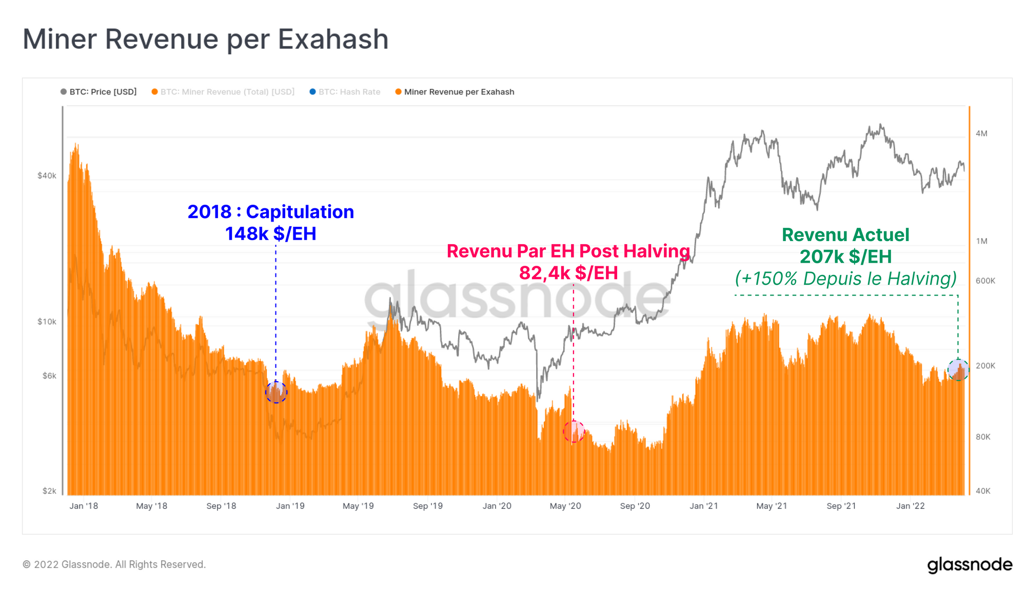 Malgré l'immense concurrence et le fait que la récompense de bloc en BTC soit proche de son plus bas niveau historique, les revenus des mineurs en USD restent 150 % plus élevés qu'immédiatement après le dernier halving de mai 2020. Les mineurs gagnent actuellement environ 207 000 dollars par exahash qu'ils fournissent au réseau.
