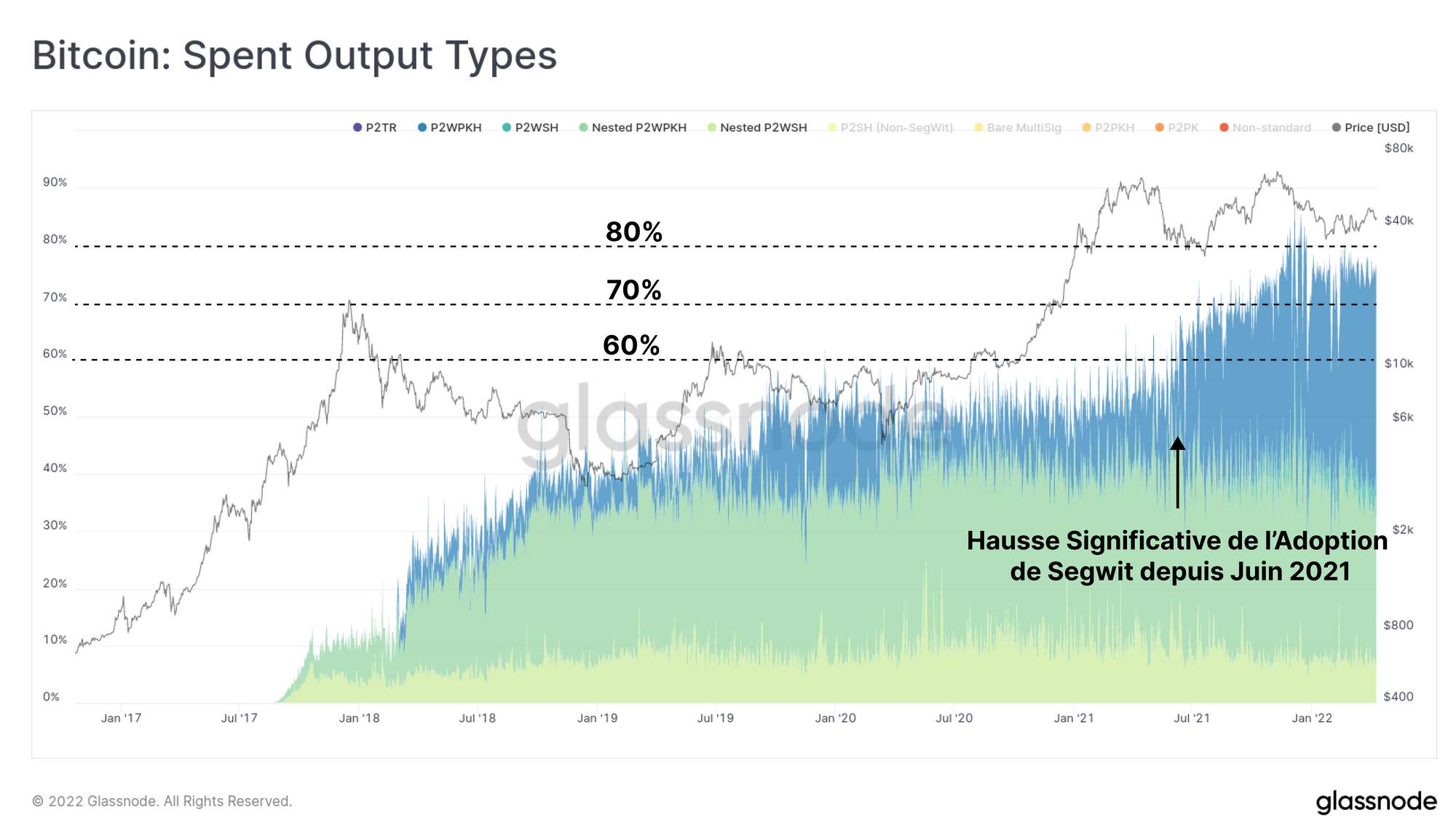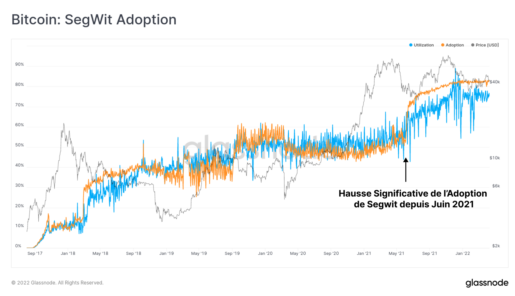 Le graphique ci-dessous montre que depuis juin 2021, il y a eu une augmentation significative de l'adoption et de l'utilisation de SegWit, car de plus en plus de portefeuilles et d'échanges mettent en œuvre cette technologie (lisez la suite de notre recherche sur l'utilisation de SegWit et son adoption par les échanges).