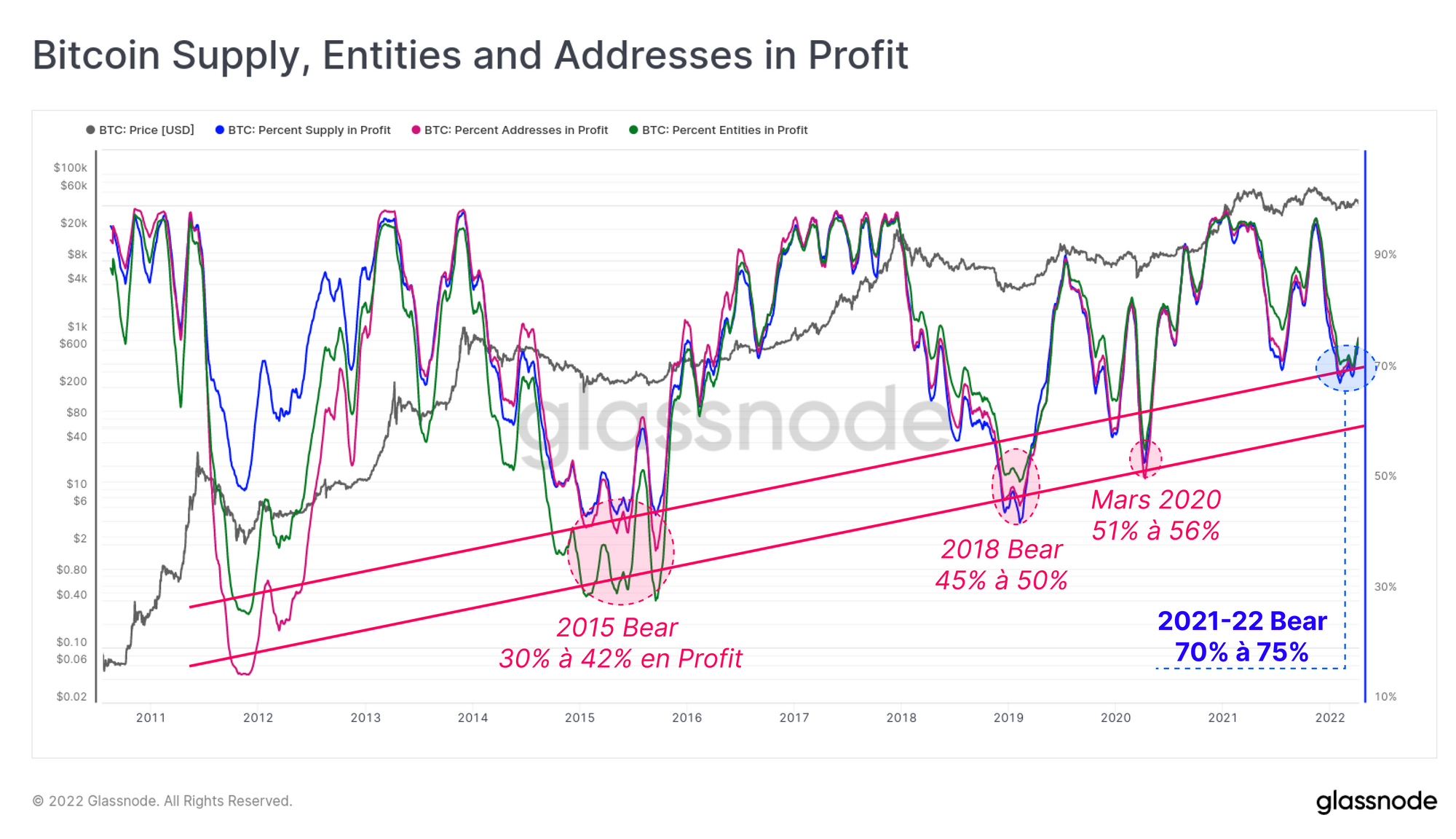 Nous pouvons constater que le marché baissier actuel n'est pas aussi douloureux que les pires phases de tous les cycles précédents, avec seulement 25 à 30 % du marché en perte non réalisée.