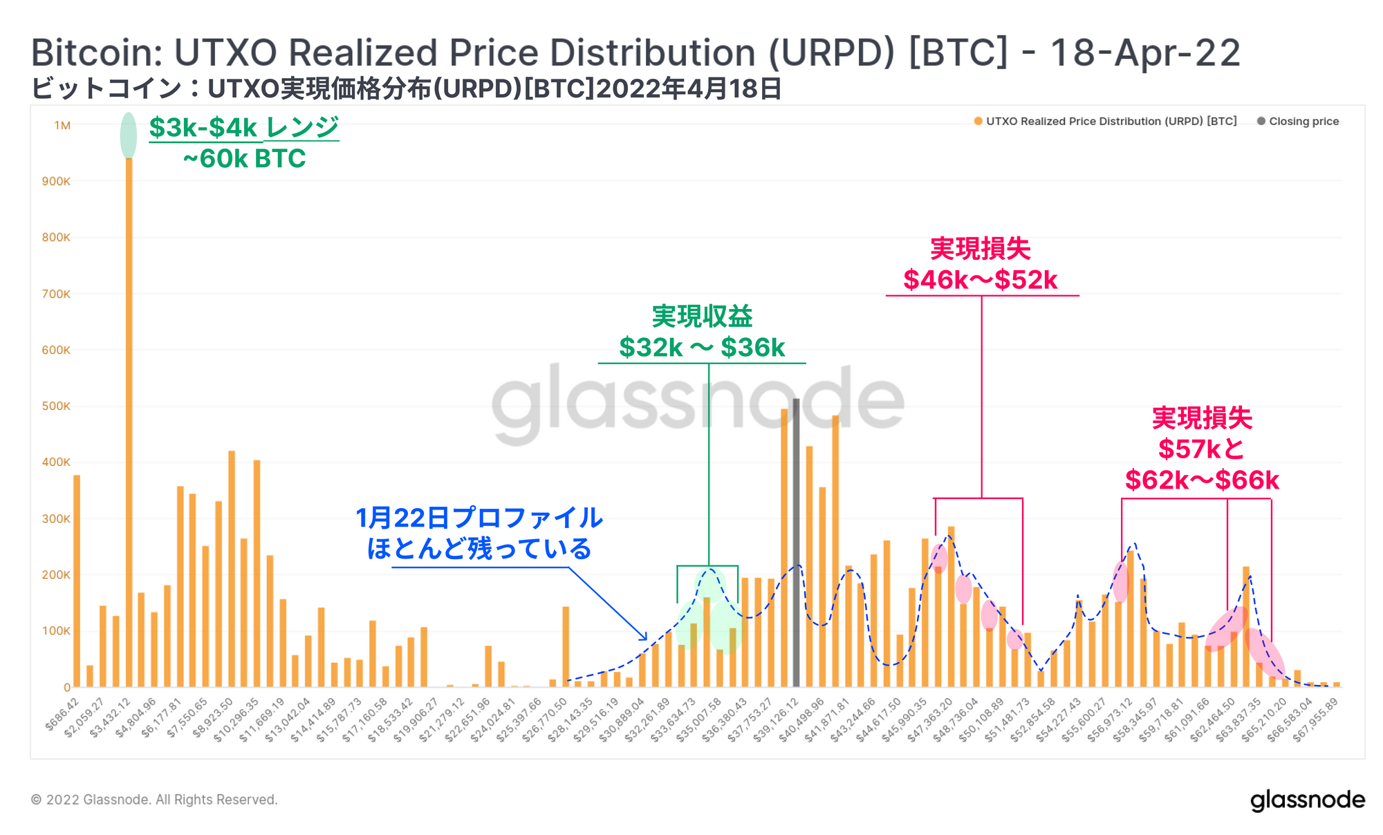 ・緑色:33kドルの安値以降に利益で再配布されたコインは、主にディップバイヤー(32kドルと36kドル)から来ていると思われ、また3kドルから4kドルの価格帯で60k BTCという比較的大きい取引高がある。