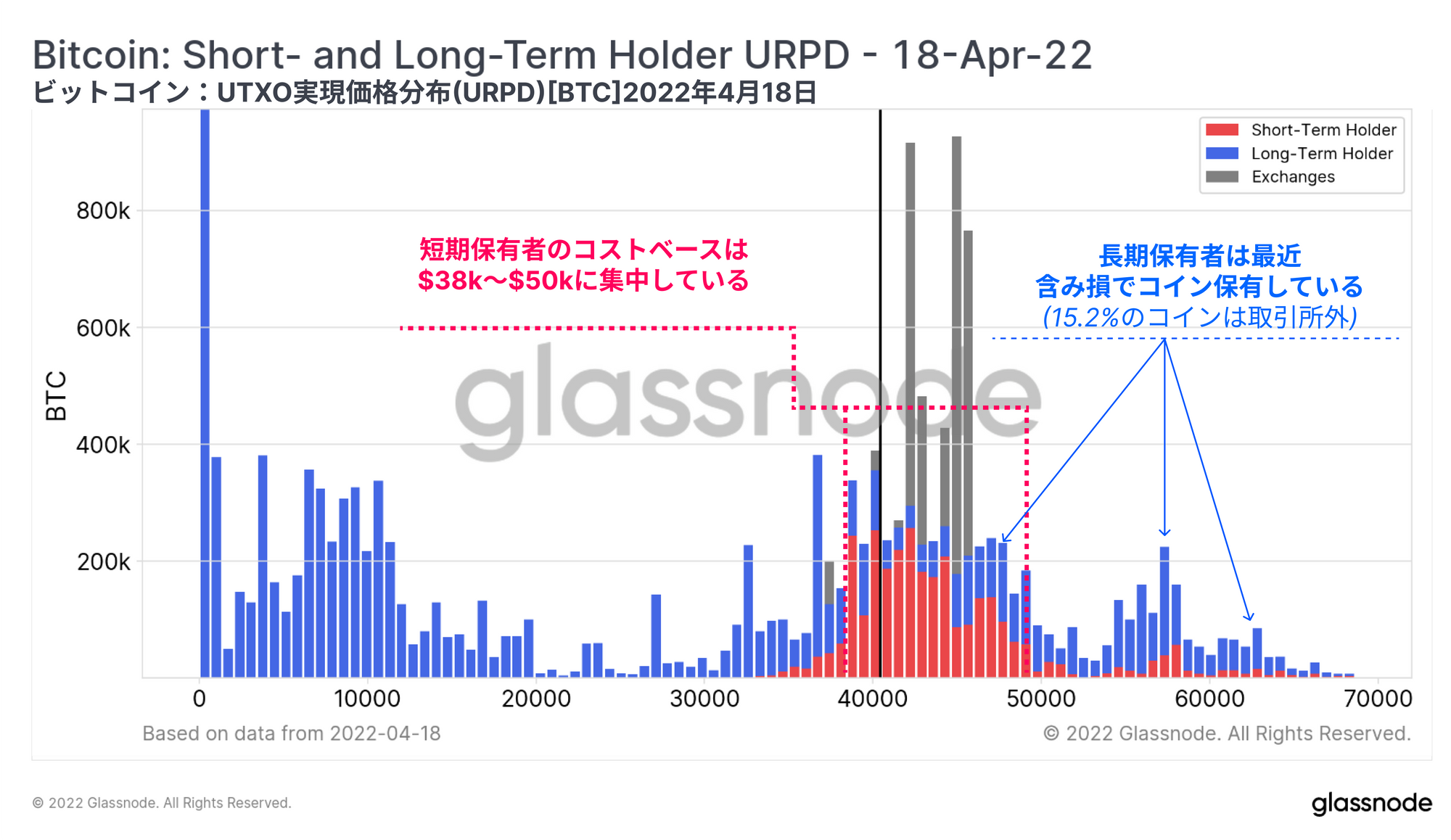 下図は、現在の取引量を長期保有者(青色)と短期保有者(赤色)に分けたものである。以下のような結論が導き出される: