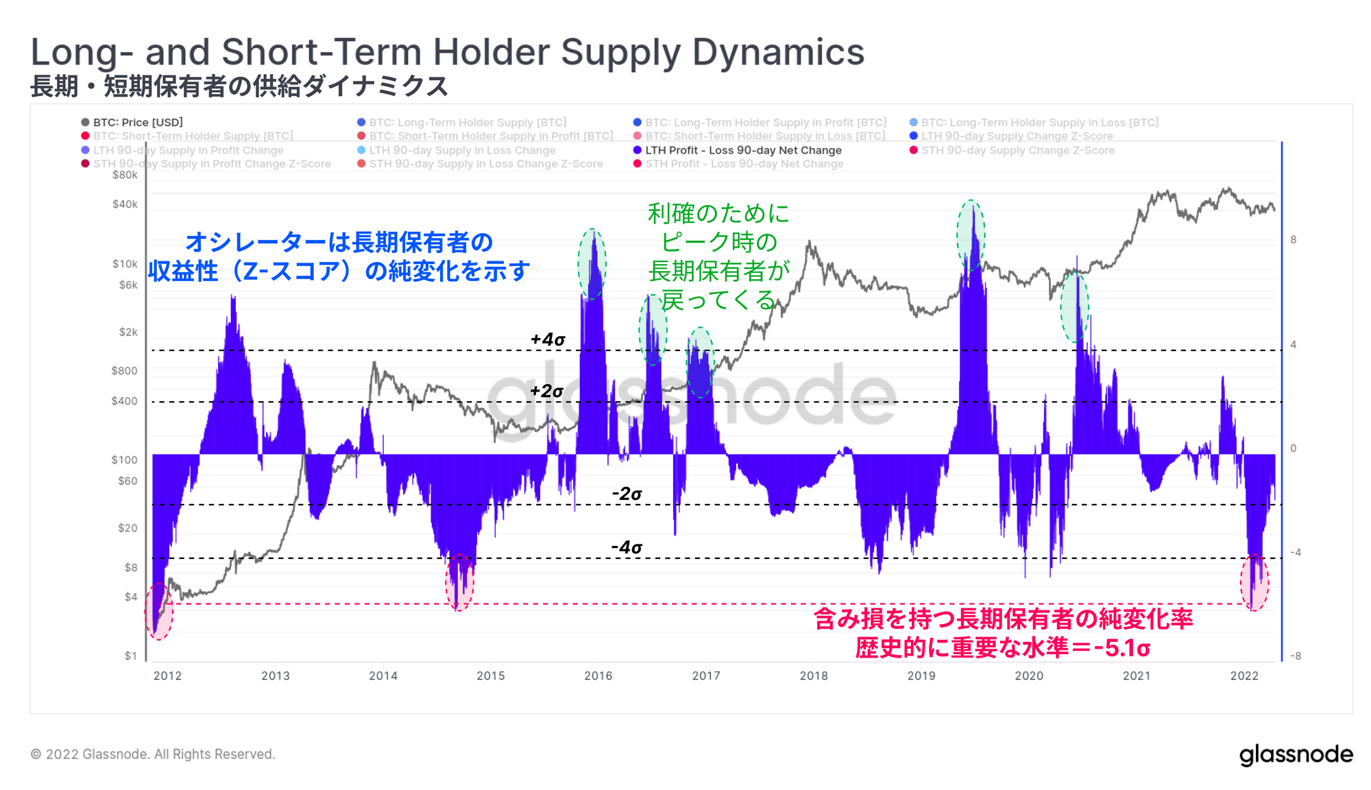 ・このオシレーターは、多くの長期保有者のコインが損失に陥ったときにマイナスになる。これは、価格が下落し、長期保有者が急激な調整に捕まった結果である。