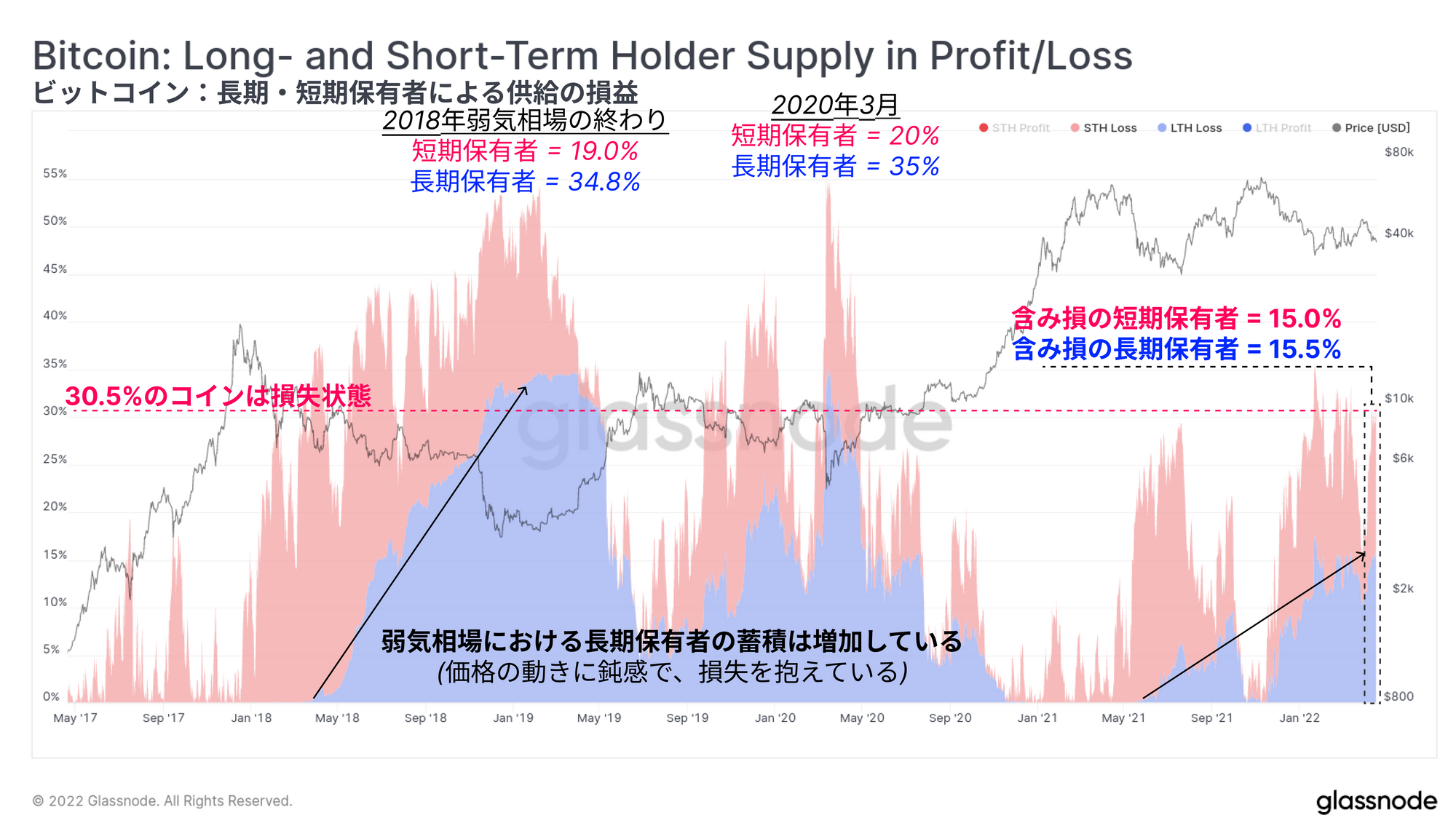 現在の市場の収益性は、2018年や2020年の弱気相場のときよりも大幅に改善されている。当時は長期保有者だけでコイン供給の35%以上を含み損で保有していた。さらに、価格に敏感でない長期保有者が保有するコインがマクロ的に増加していることがわかる(黒矢印)。これは、蓄積と長期保有者が価値を見出し取得を行いながら、その後の価格下落を乗り切ろうとした結果である。
