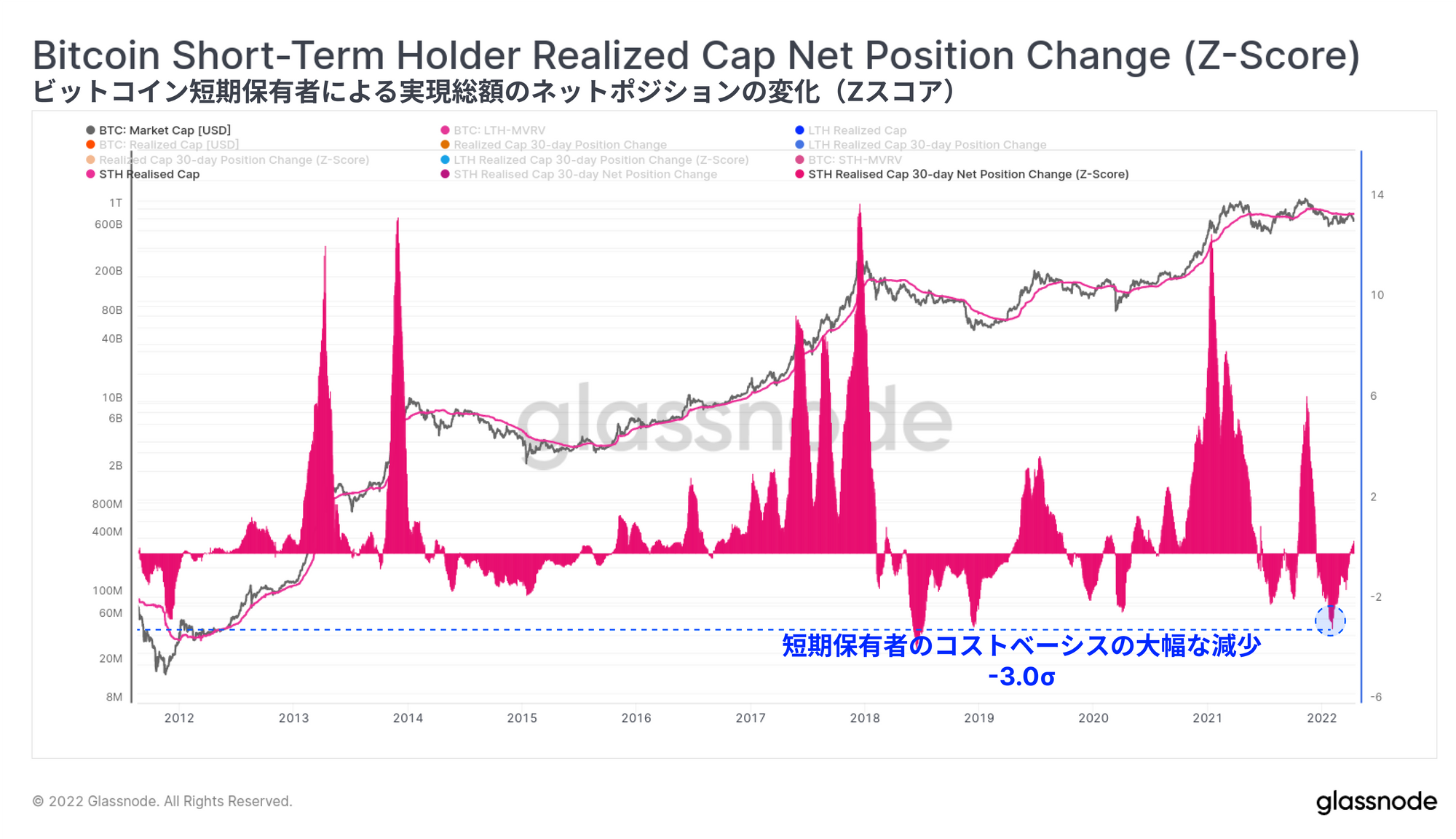 短期保有者の実現総額の下落率(コストベース、Z-Score)を見ると、またしても歴史的な高さで下落していることがわかる。短期保有者の実現損の大きさは、過去に2回だけ同じような大きさになったことがあり、いずれも2018年の弱気相場における最悪の局面で発生したものである。