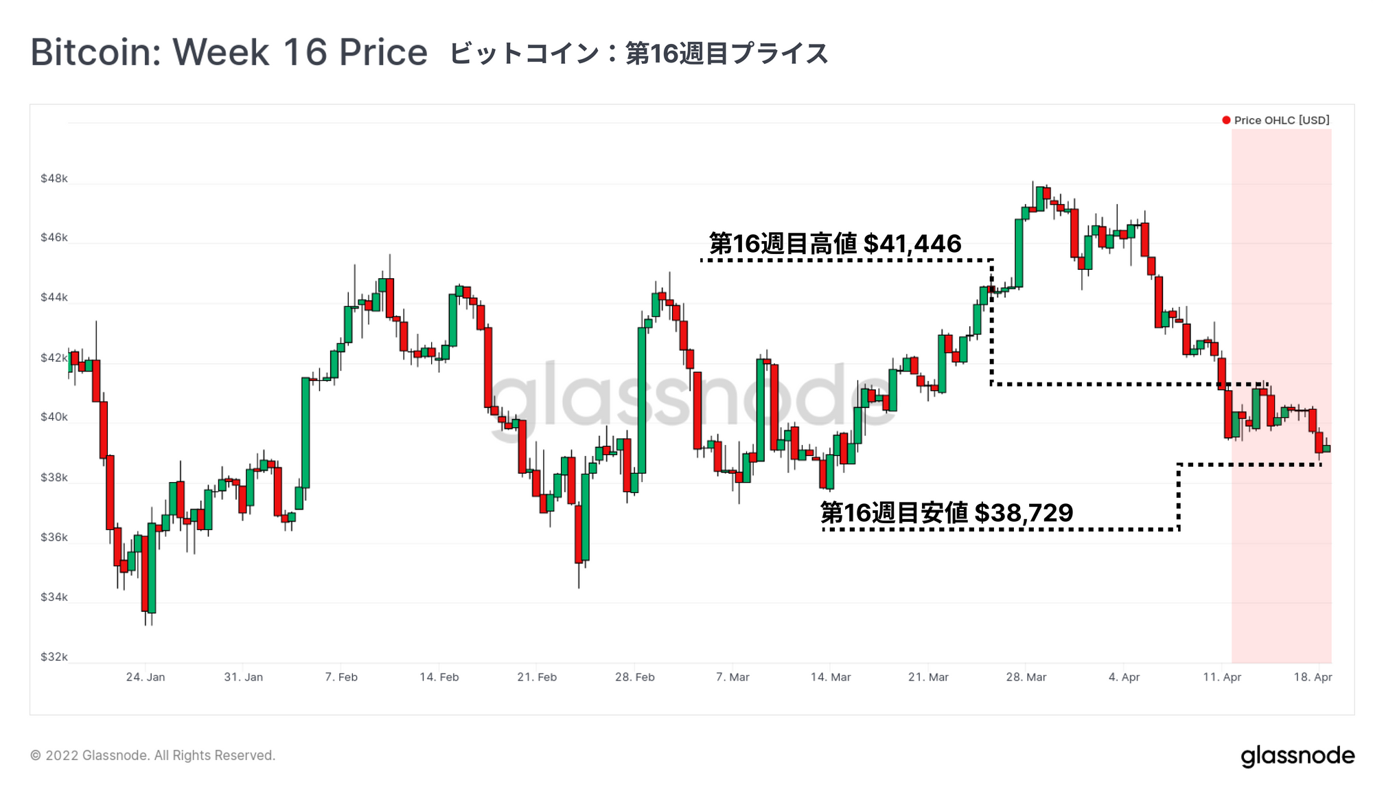 ビットコイン投資家にとっては今週も弱含みの展開となり、価格は一時4万ドルを割り込み、3月の上昇相場から完全に反落した。週明けには41,446ドルの高値でピークとなった後に下落し、38,729ドルの安値をつけた。