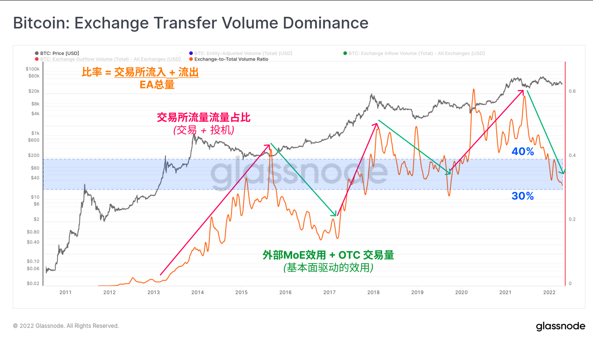 然后,我们可以在总汇兑流量(流入+流出)和总转账量之间取一个比率,试图观察与汇兑交易主导地位相关的周期性模式。