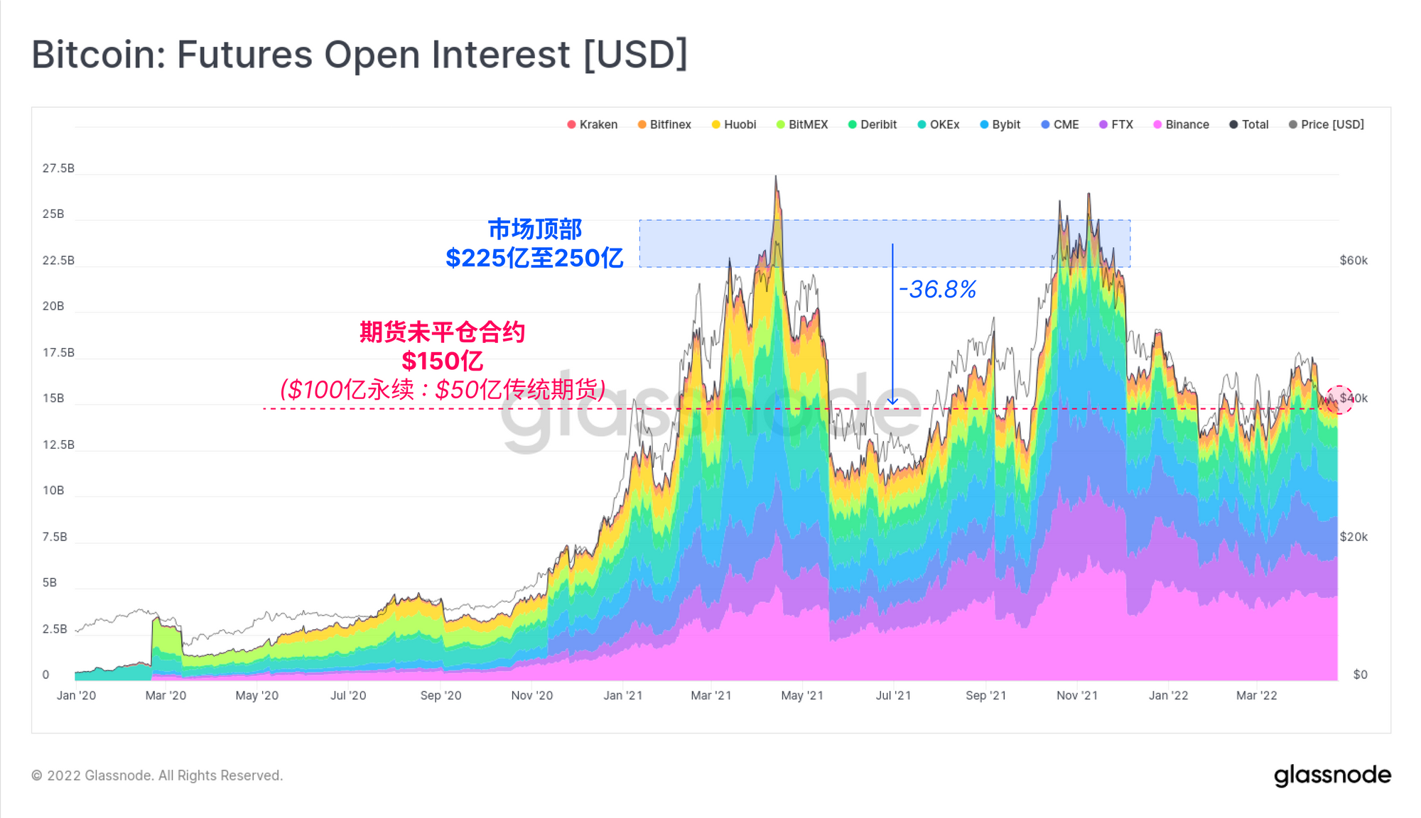 - 粉色 代表相同的主导地位概念,但适用于期货未平仓合约,自2020年12月以来,其主导地位已从50%上升到66%以上。