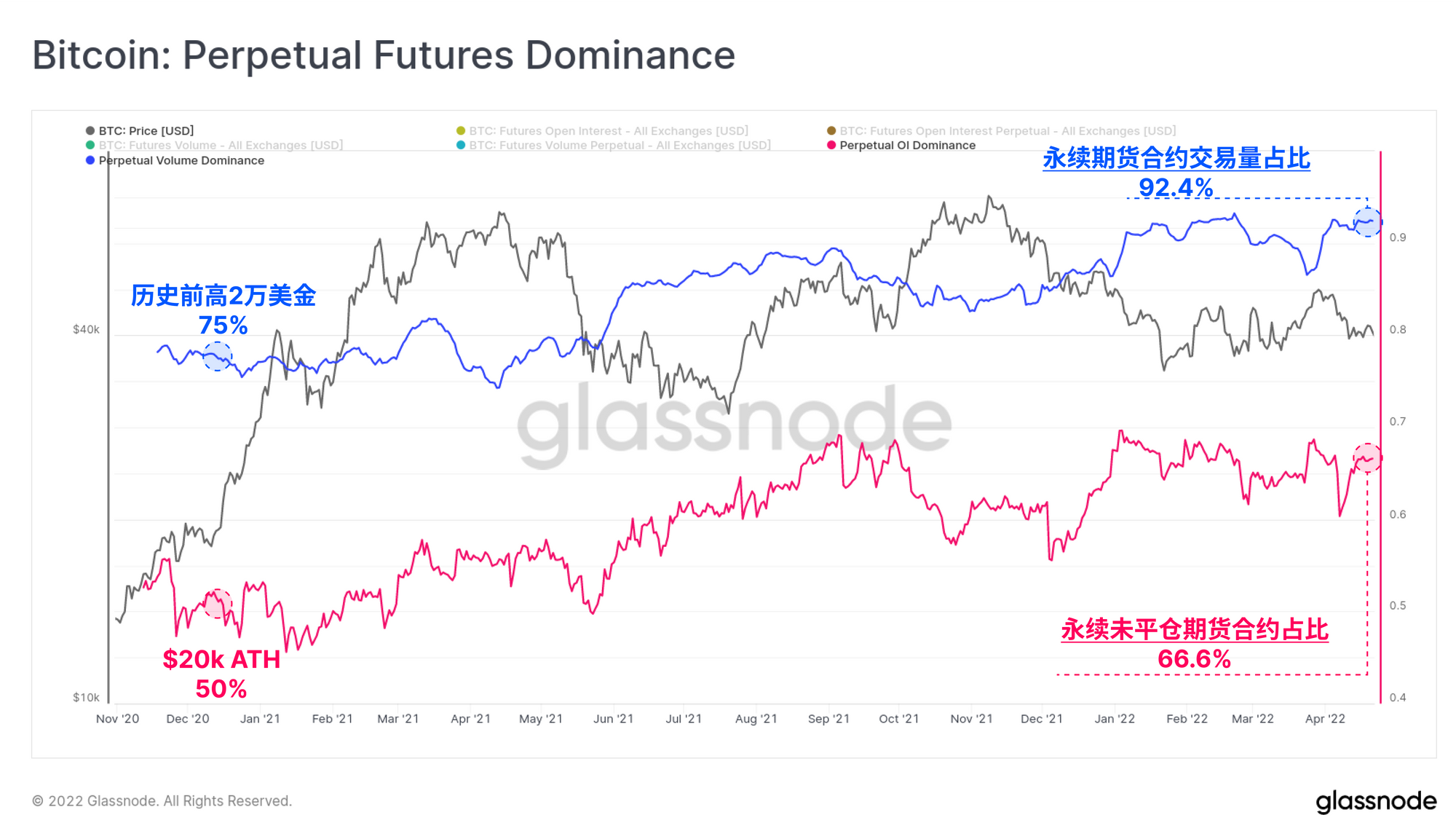 - 蓝色 代表了永续掉期交易量相对于总期货量的主导地位,目前显示占据92.4%的主导地位。这比2020年12月的75%的主导地位有所增加,因为市场突破了上个周期的2万美元的历史前高。