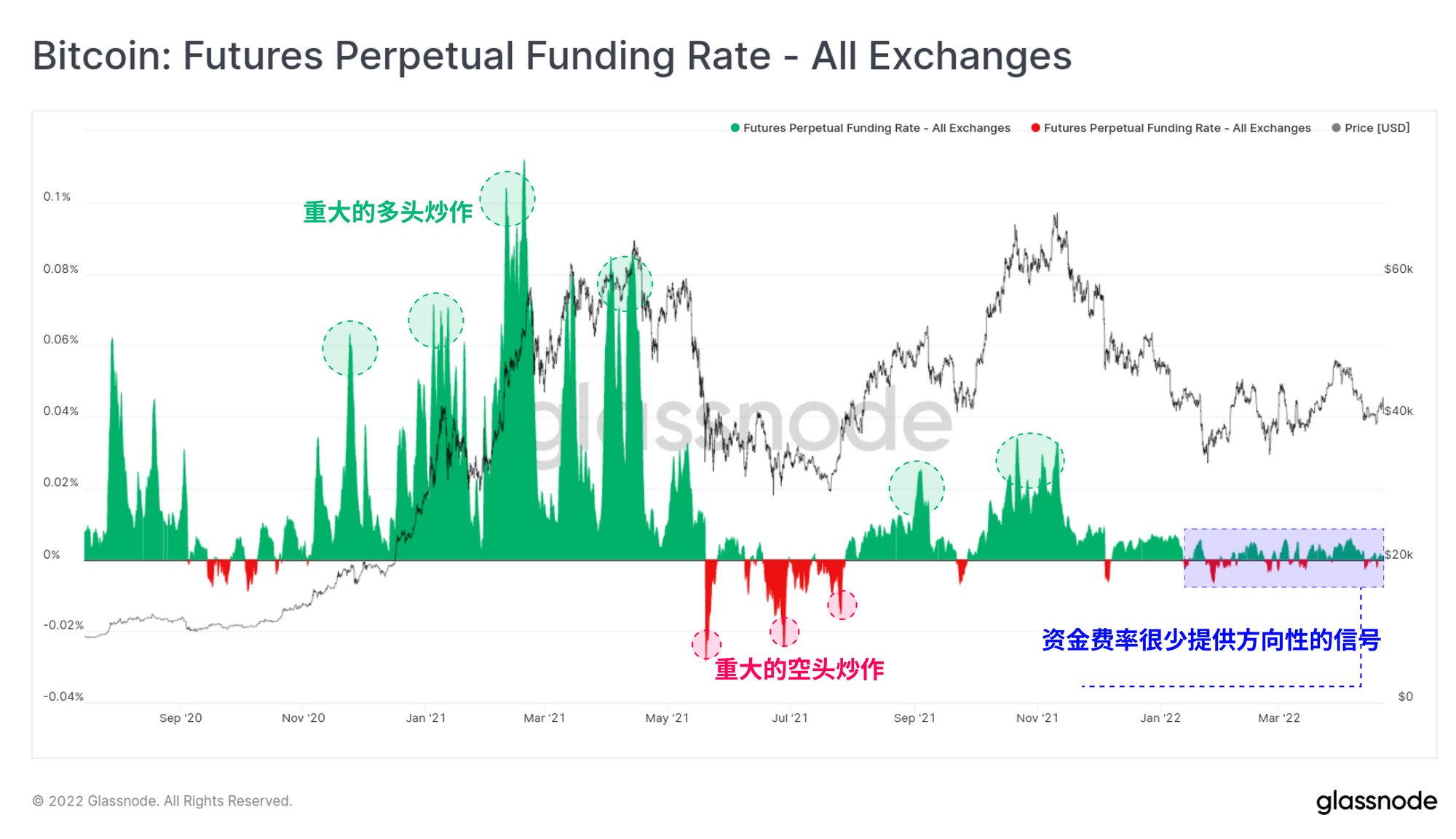 如果我们看一下永续互换资金利率,我们可以看到2022年的大部分时间里,可用收益率非常低,而且几乎没有方向性偏差。这与2021年上半年和8-11月再次出现的超级看涨的多头投机,以及2021年5-7月的极端看跌时期形成了鲜明的对比。