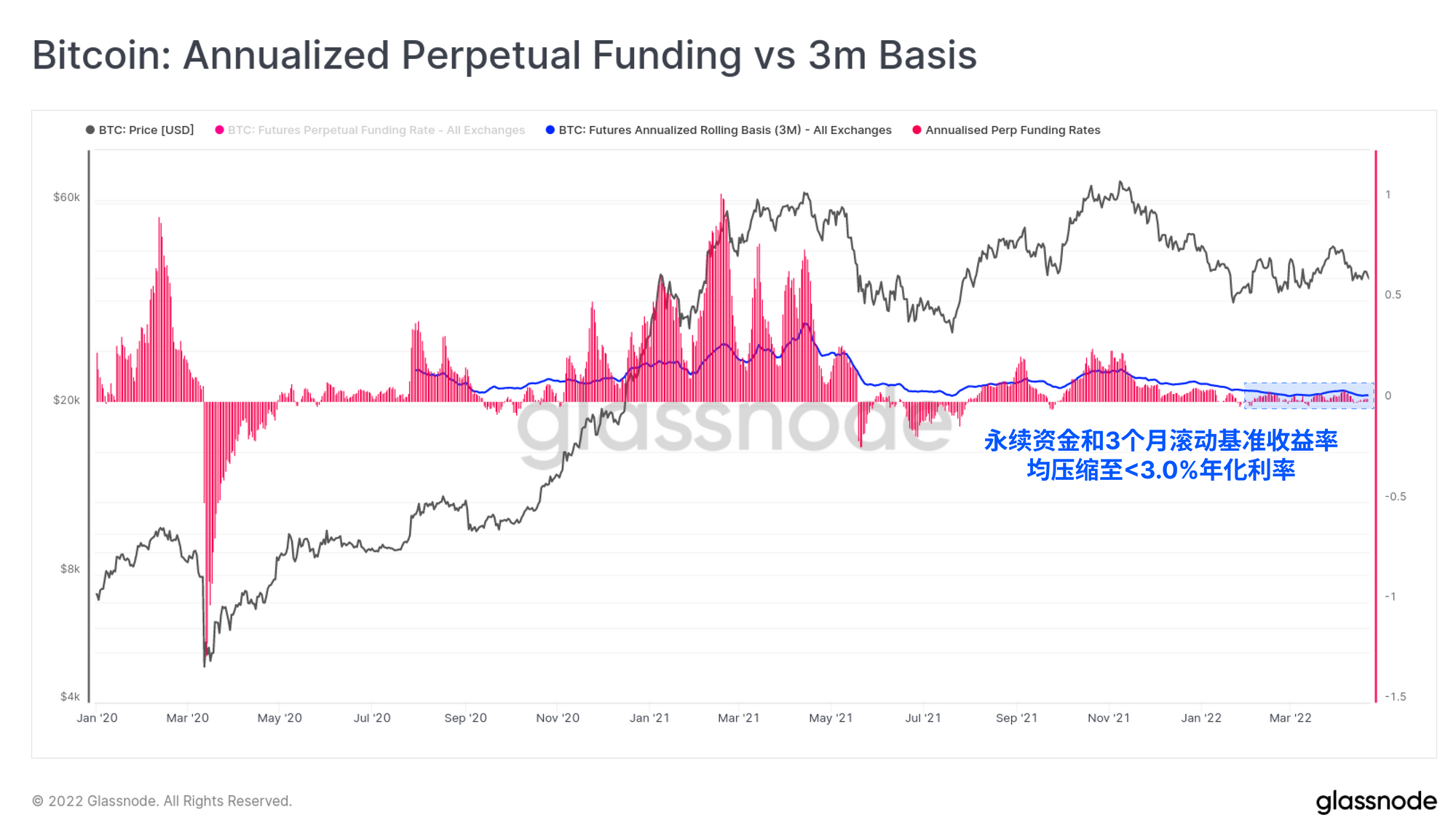 如果我们将永久资金利率年化,并将其与日历期货中的3个月滚动基础进行比较,我们可以看到资本正在轮流离开比特币市场的一个可能原因。