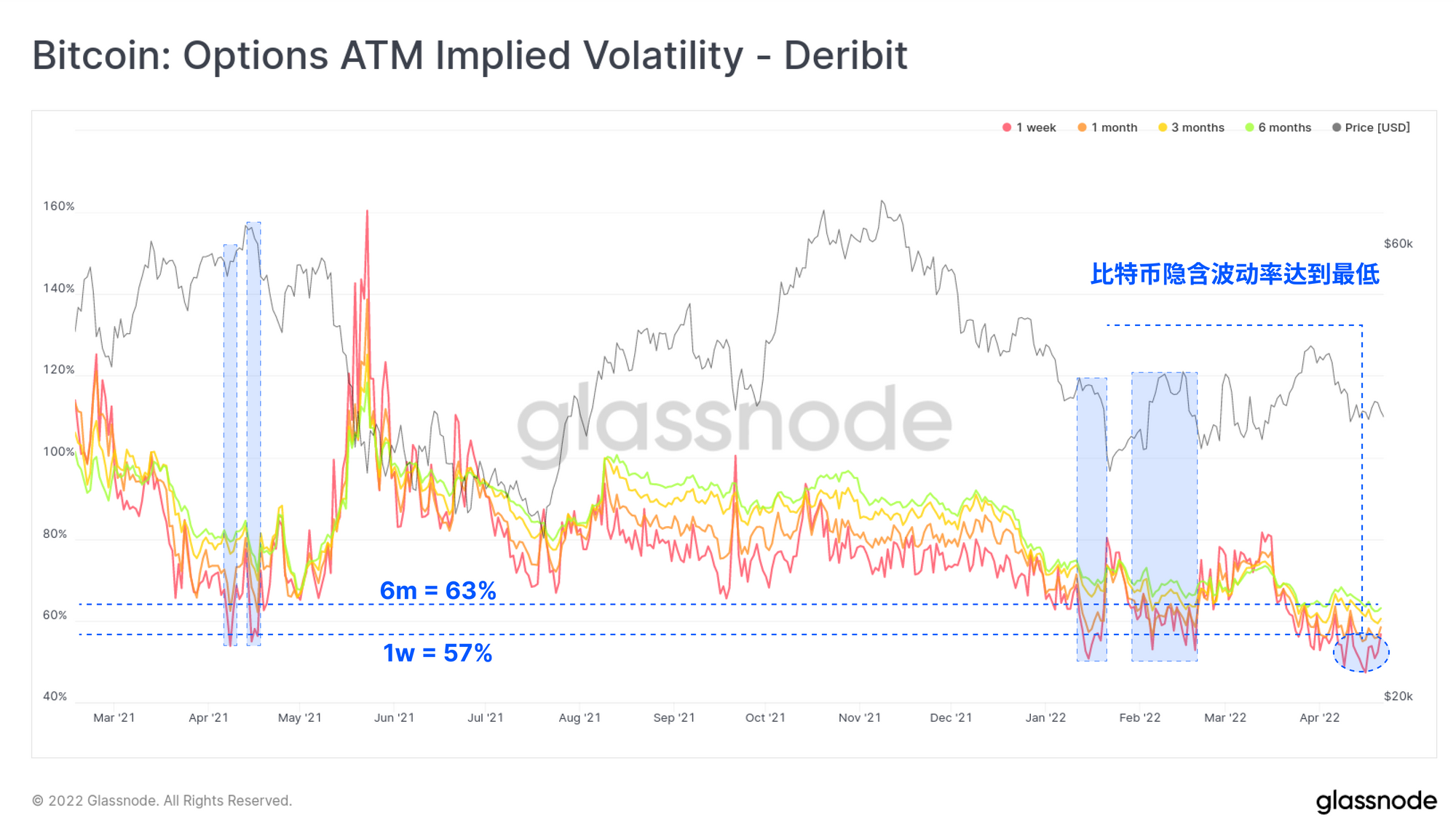 我们还可以观察到,期权市场正在对历史上的低隐含波动率进行定价,在过去几周内突破了60%。在过去一年中,很少有隐含波动率如此之低的情况,其中大部分是在目前的盘整区间,该区间几乎包含了今年迄今为止的所有价格走势。