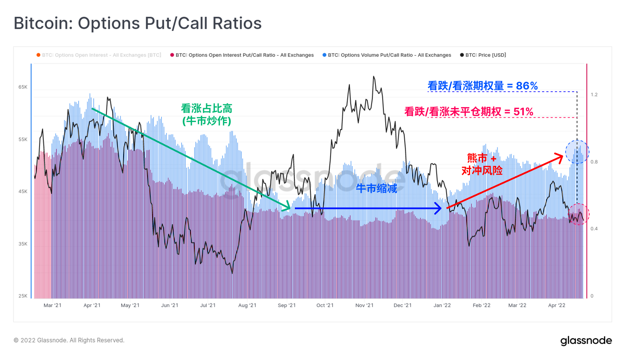 在与期权交易量(蓝色)和未平仓合约(粉色)相关的看涨与看跌比率中,我们也可以看到情绪和风险管理的普遍转变。2021年的大部分时间里,看涨期权的需求占主导地位,直到9月,看涨情绪似乎开始逐渐减少。2022年开始,市场出现了对看跌期权的明显偏好,因为更多的看跌情绪占据了上风,对冲下行风险的需求增加。