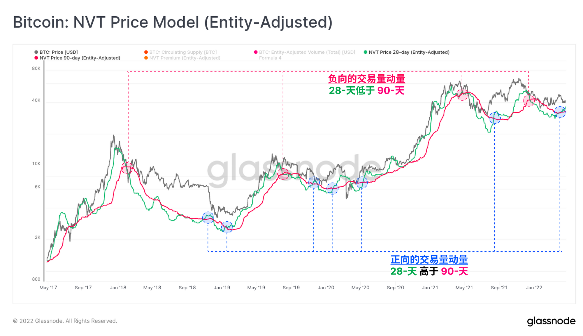28天(绿色)和90天(粉色)分别用来建立快速和慢速信号。这两个模型目前对比特币的估值在3.25万美元(90天)和3.61万美元之间,两者都开始触底并有可能逆转。值得注意的是最近的积极势头交叉,28日线突破了90日线。