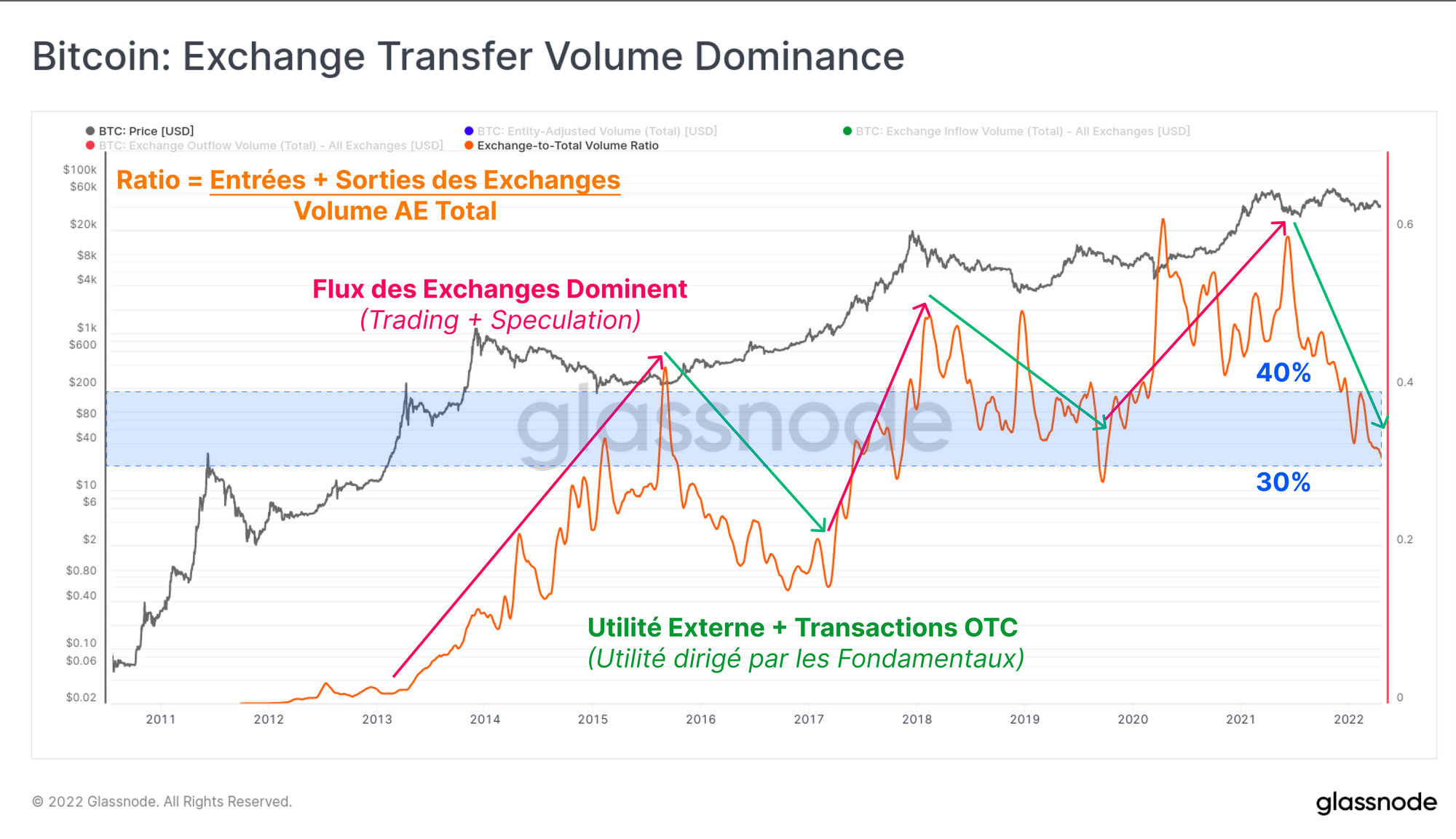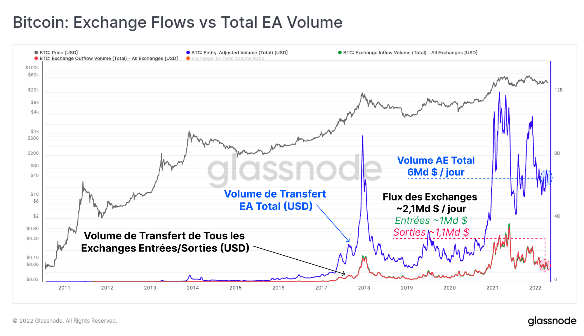 Les volumes de transfert entrant et sortant des exchanges ont toujours représenté une part importante des flux de transaction globaux et il est important de les évaluer dans leur contexte. Le graphique ci-dessous montre le volume total ajusté par entité (bleu), en comparaison avec les entrées (vert) et les sorties (rouge) des exchanges , le tout dénominé en USD.