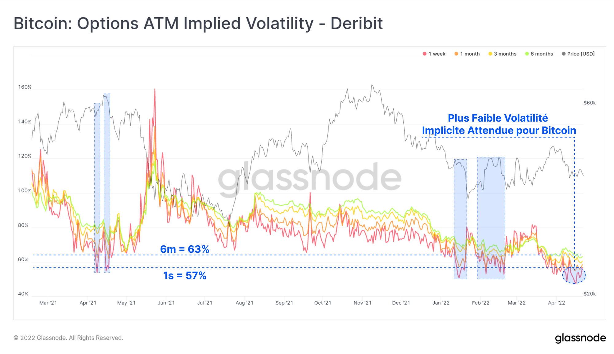La volatilité implicite des marchés d'options est également passée sous la barre des 60 % cette semaine, ce qui est nettement inférieur à la volatilité de plus de 80 % qui a caractérisé la majeure partie de l'année 2021.