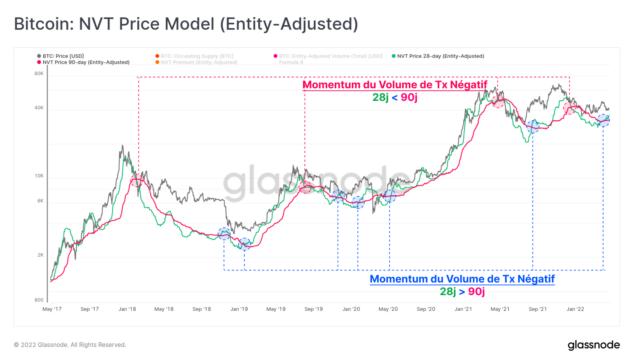 Une période de 28 jours (vert) et de 90 jours (rose) est utilisée pour établir un signal respectivement rapide ou lent. Ces deux modèles évaluent actuellement le bitcoin entre 32,5 k$ (90 jours) et 36,1 k$. Il convient de noter le récent croisement positif du momentum, le 28 jours, plus rapide, dépassant le 90 jours.