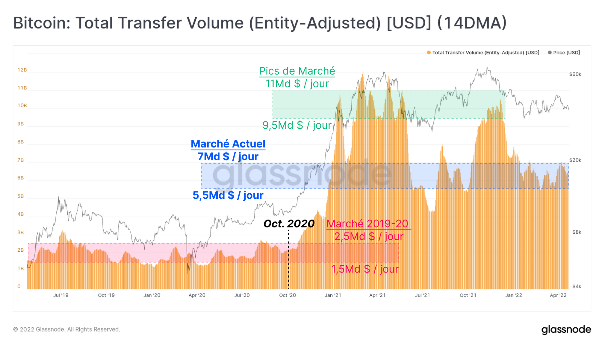 Si l'on s'éloigne des marchés dérivés, on constate qu'une tendance similaire de baisse du volume global prend place sur les volume de transfert. Le réseau Bitcoin gère actuellement entre 5,5 et 7,0 milliards de dollars par jour, ce qui représente une baisse d'environ 40 % par rapport aux 9,5 à 11,0 milliards de dollars quotidiens observés lors des pics de marché haussier.