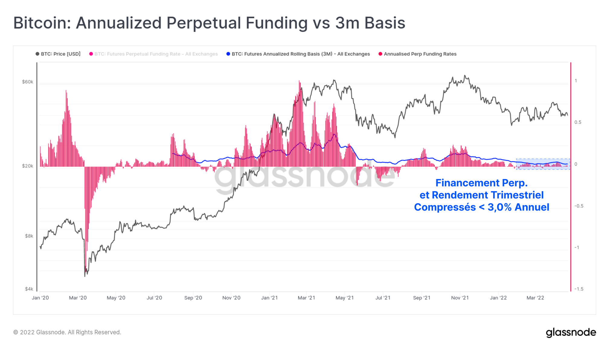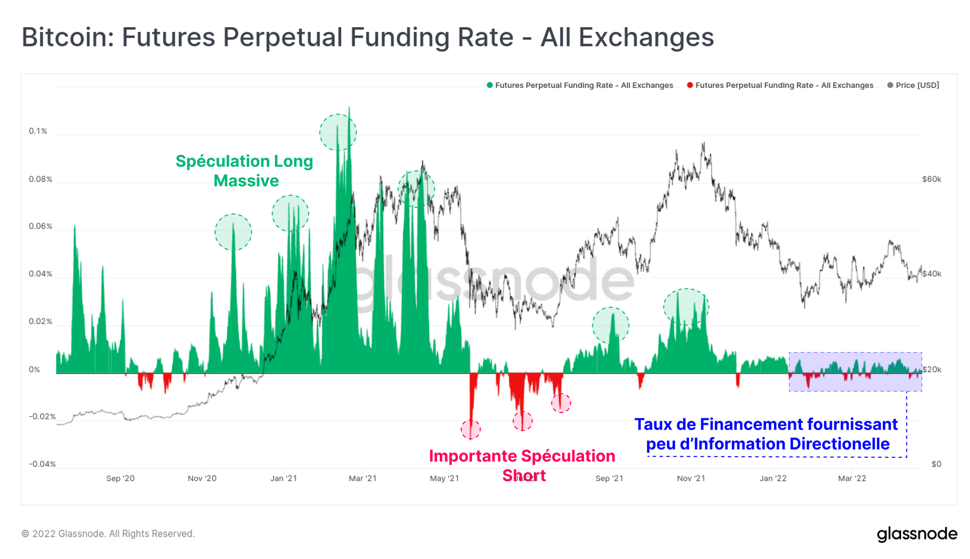 Si nous examinons les taux de financement des swaps perpétuels, nous pouvons constater que la majorité de l'année 2022 a été marquée par des rendements très bas et par un faible biais directionnel. C'est un contraste frappant si l'on tient compte des spéculations long hyper optimistes du premier semestre 2021 et d'août à novembre, ainsi que des périodes de short importantes de mai à juillet 2021.