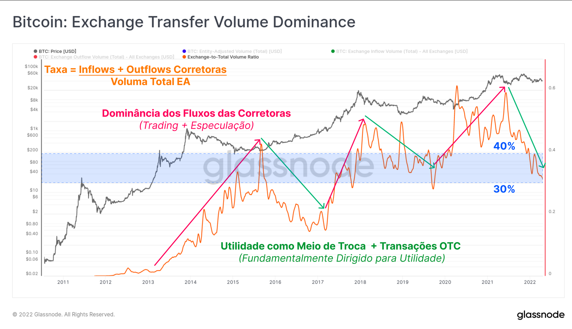 Podemos então tomar uma razão entre os fluxos totais de corretoras (entradas + saídas) e o volume total de transferências, na tentativa de observar padrões cíclicos associados à dominância das transações de corretoras.