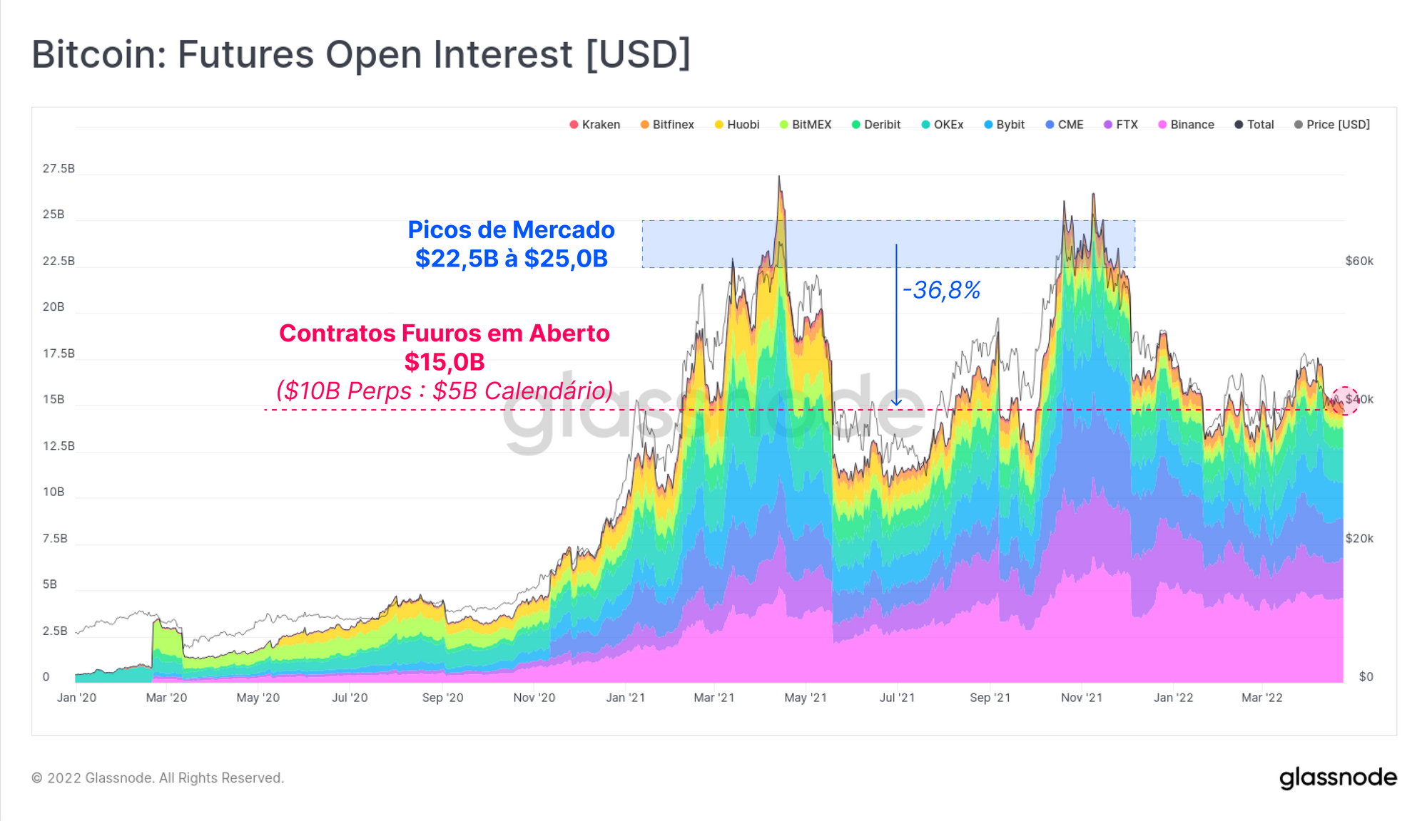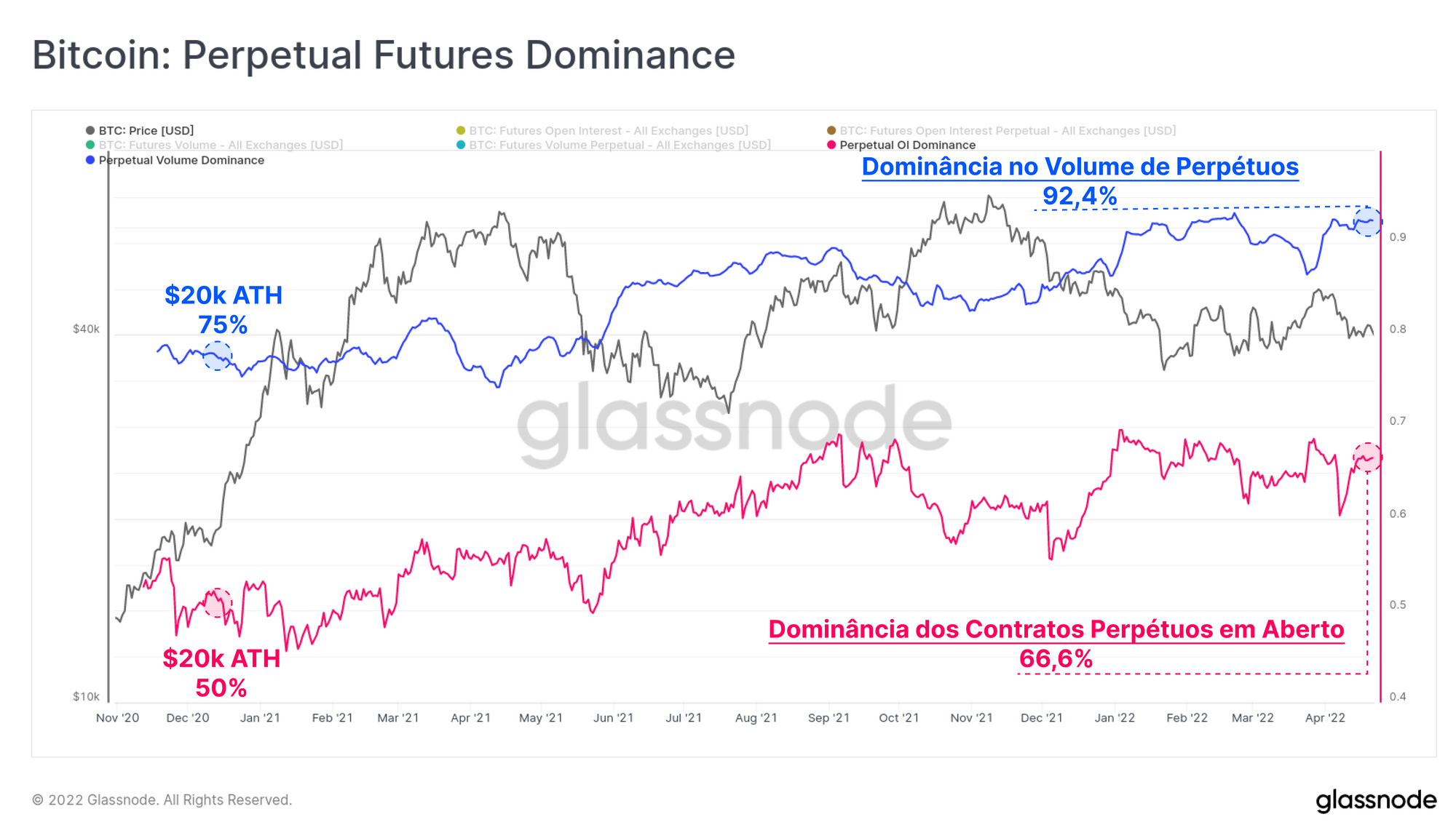 - Rosa representa o mesmo conceito de dominância, mas aplicado a contratos futuros em aberto (OI = Open Interest), que subiu de 50% para mais de 66% de dominância desde dezembro de 2020.