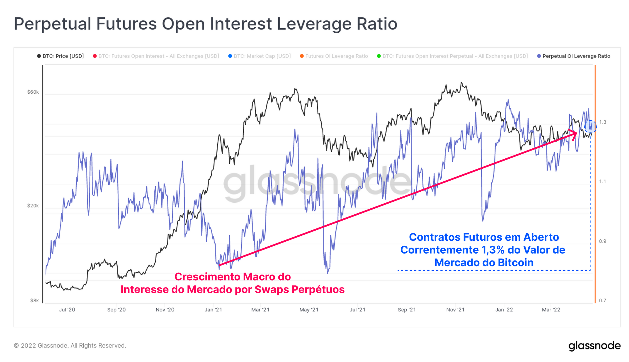 Essa tendência também pode ser observada no Índice de Alavancagem de Futuros, que se mantém em tendência estrutural de alta. Isso reflete uma tendência crescente do mercado empregando capital preferencialmente em mercados de swap perpétuos, em vez de futuros com vencimento. Atualmente os contratos em aberto de swaps perpétuos é equivalente a 1,3% do valor de mercado do Bitcoin, que está se aproximando das máximas históricas.