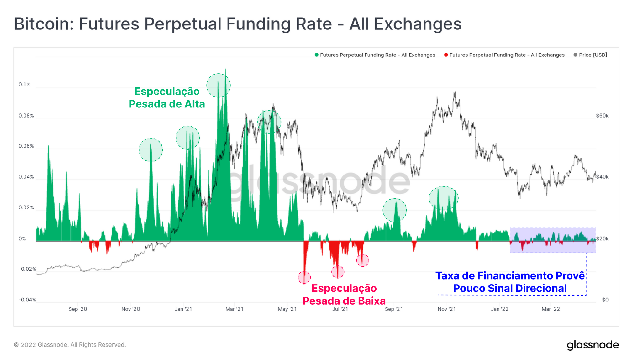 Se olharmos para as taxas de financiamento de swap perpétuo, podemos ver que a maior parte de 2022 teve rendimentos disponíveis muito baixos e pouco viés direcional. Este é um forte contraste com a longa especulação hiper-altista no H1-2021 e novamente de agosto a novembro, e períodos baixistas ao extremo em maio-julho de 2021.