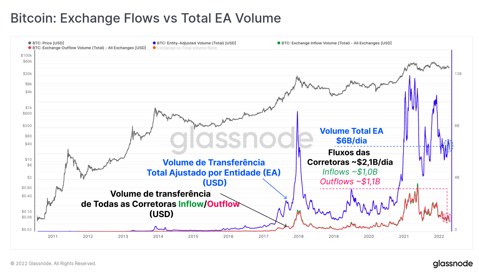 Os volumes de transferência para dentro e para fora das corretoras sempre representaram uma parcela significativa dos fluxos gerais de transações e são importantes de se avaliar no contexto. O gráfico abaixo mostra o volume total ajustado pela entidade (EA = Entity Adjusted) (azul), em comparação com as entradas (verde) e as saídas (vermelho) de corretoras, todas com denominação em dólares.