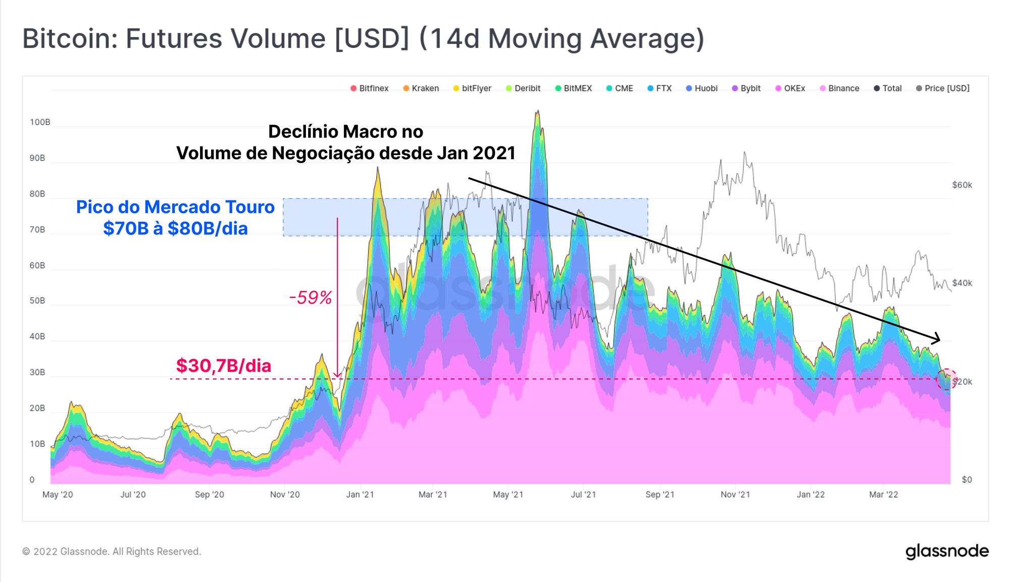 No entanto, o volume agregado de negociações de futuros está em um declínio macro desde janeiro de 2021. Durante o primeiro semestre de 2021, os volumes de negociação entre US$ 70 bilhões e US$ 80 bilhões por dia eram típicos. No mercado atual, no entanto, os volumes de negociação de futuros caíram mais de 59%, atualmente em torno de US$ 30,7 bilhões/dia. Mal houve um aumento em outubro-novembro de 2021, mesmo quando os preços atingiram novos máximas históricas.