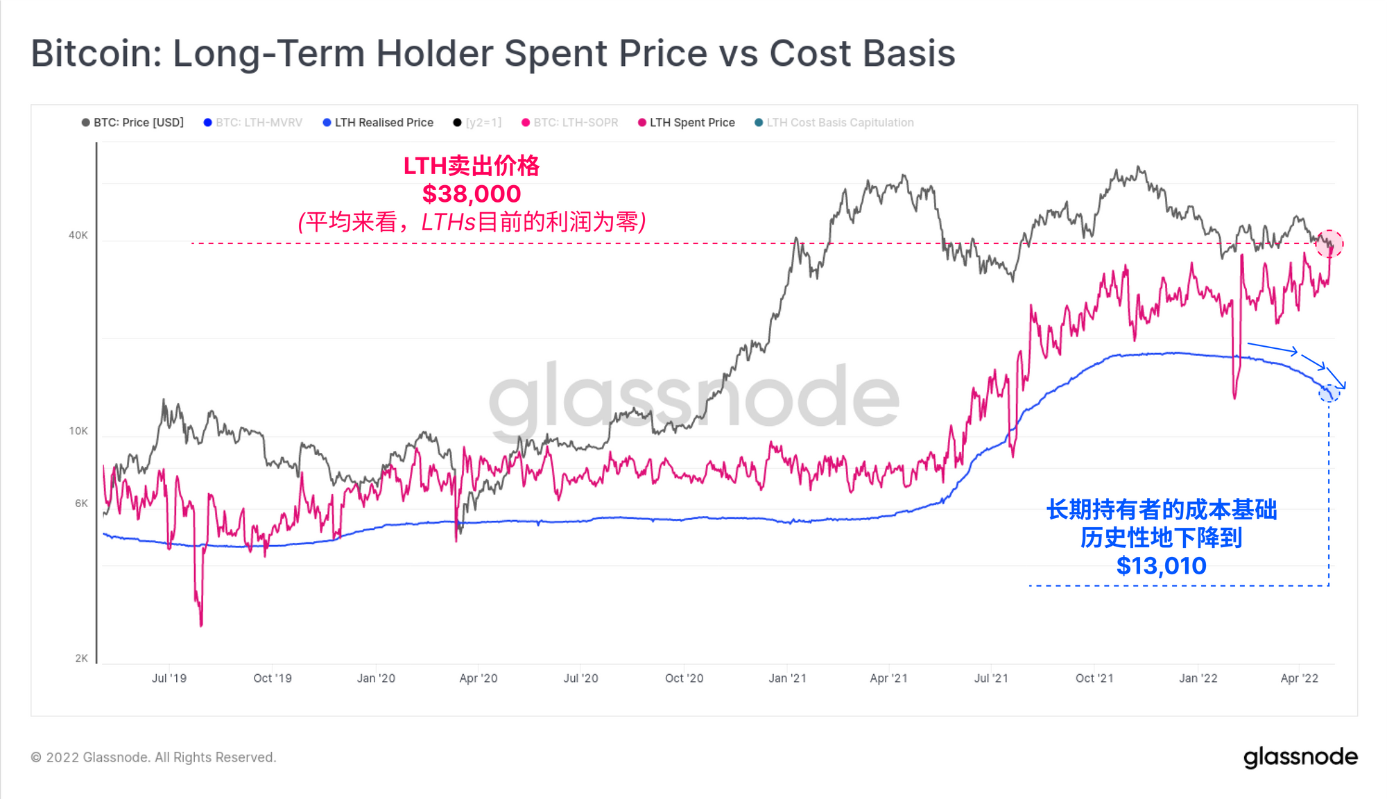 2. 长期持有者的卖出价格(粉红色):这个指标显示了长期持有者当天卖出的比特币的平均购买价格。这个指标在本周明显走高,与现货价格相吻合,并表明长期持有者在平均收支平衡的情况下恐慌性抛售。