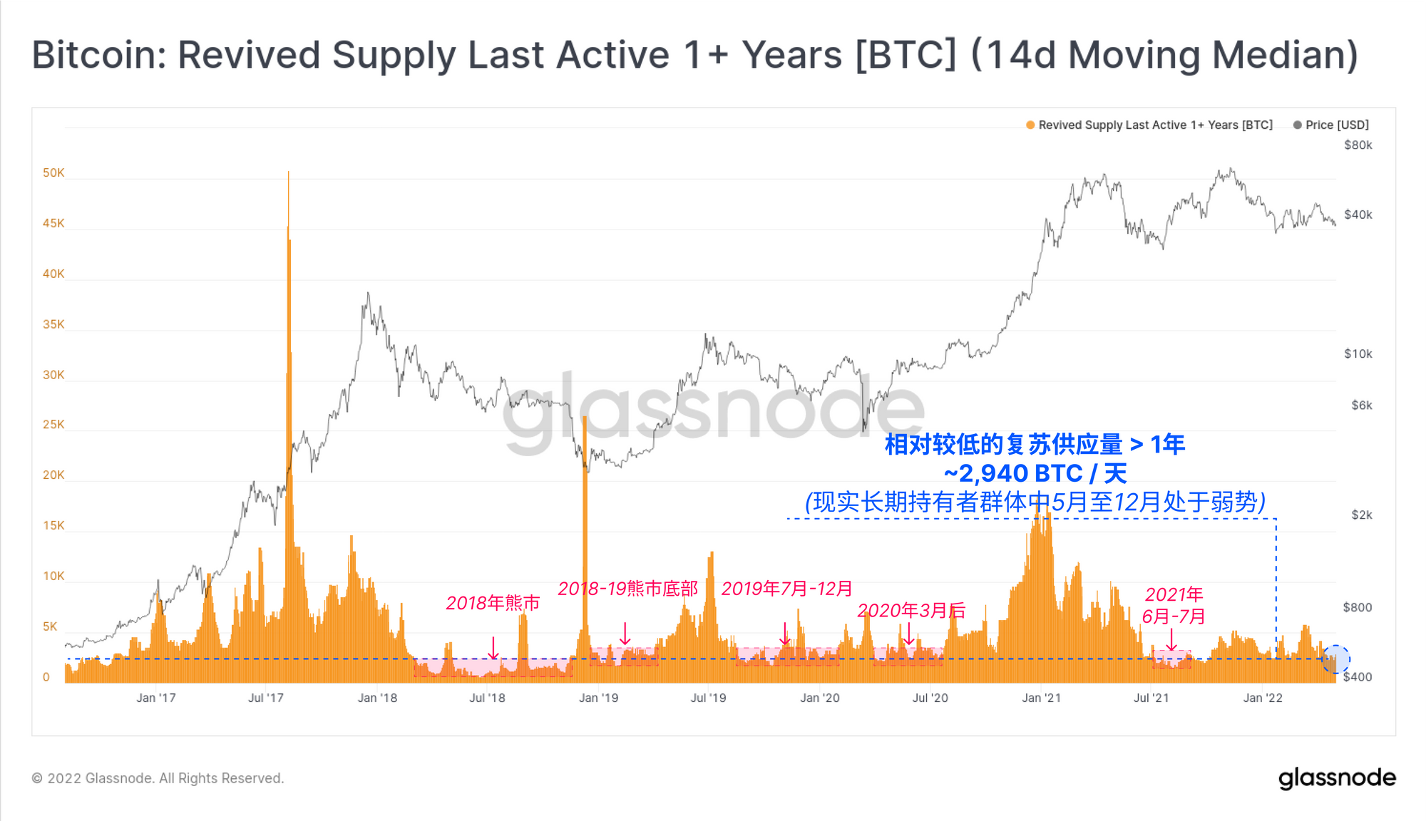 接下来我们看一下1年以上的复兴供应量,它捕捉了2021年5月中旬抛售之前购买的所有比特币链上交易量。我们可以看到的是,这个指标实际上在下降,并接近相对低点。通常情况下,复苏的供应量的非常低的读数发生在深熊中,在这种情况下,积累是长期持有者的首选行为。