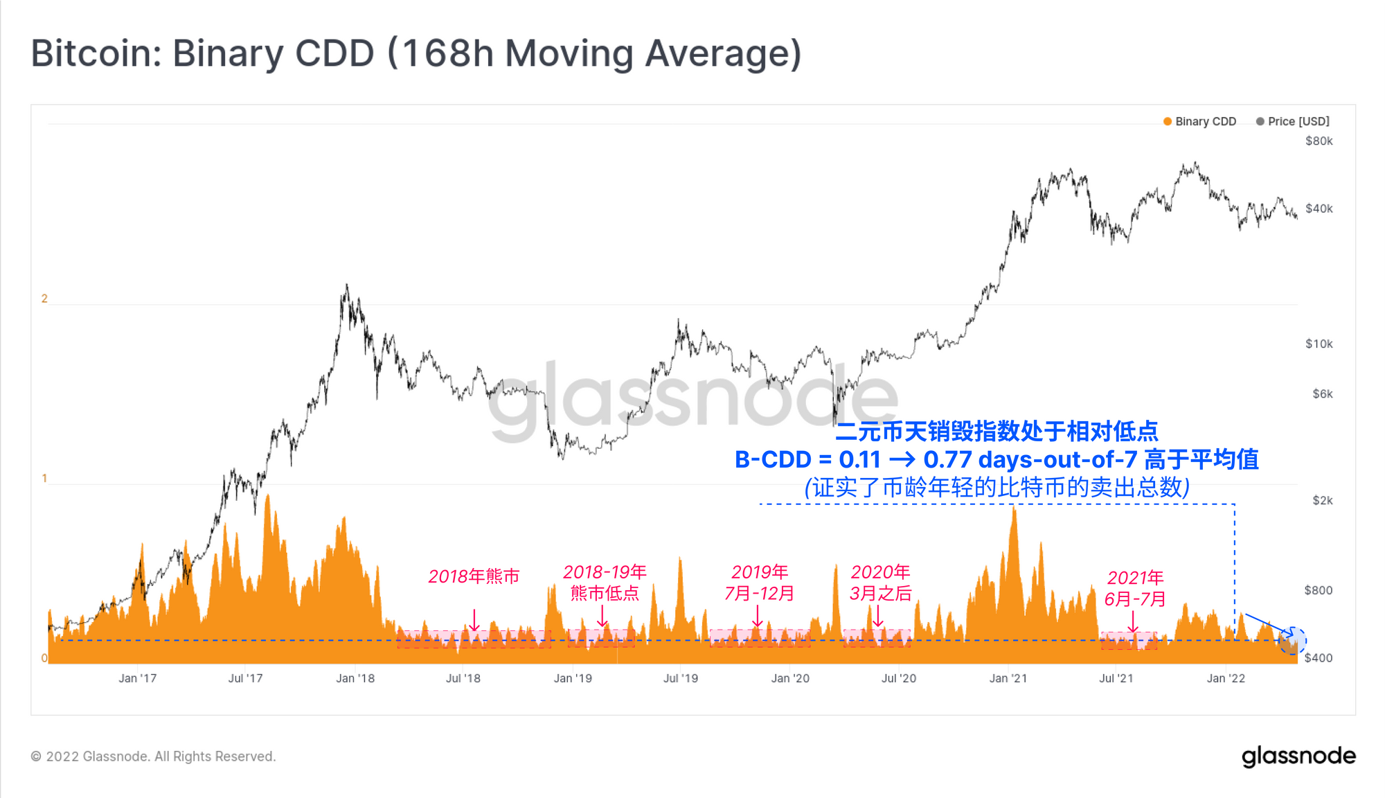 二元币天销毁指数在很大程度上证实了这一观察,其趋势和明显的标记与复苏供应量指标几乎相同。在7日平均线基础上(分辨率为小时),这个指标表明每周有18.5个小时,大于平均寿命的币天被销毁。换句话说,89%的时间里,老币的所有者选择让他们持有的比特币处于休眠状态,并没有为卖压作出贡献。