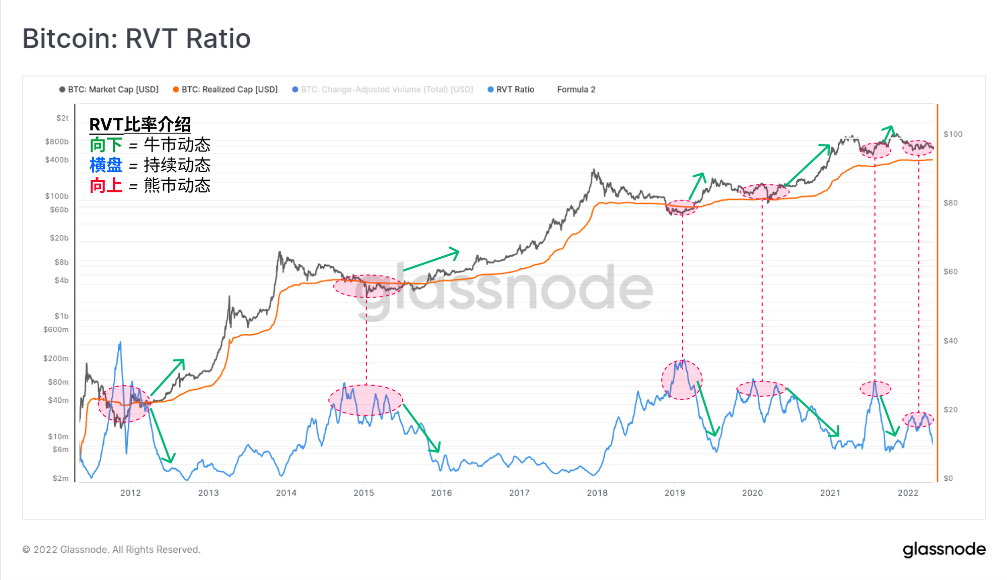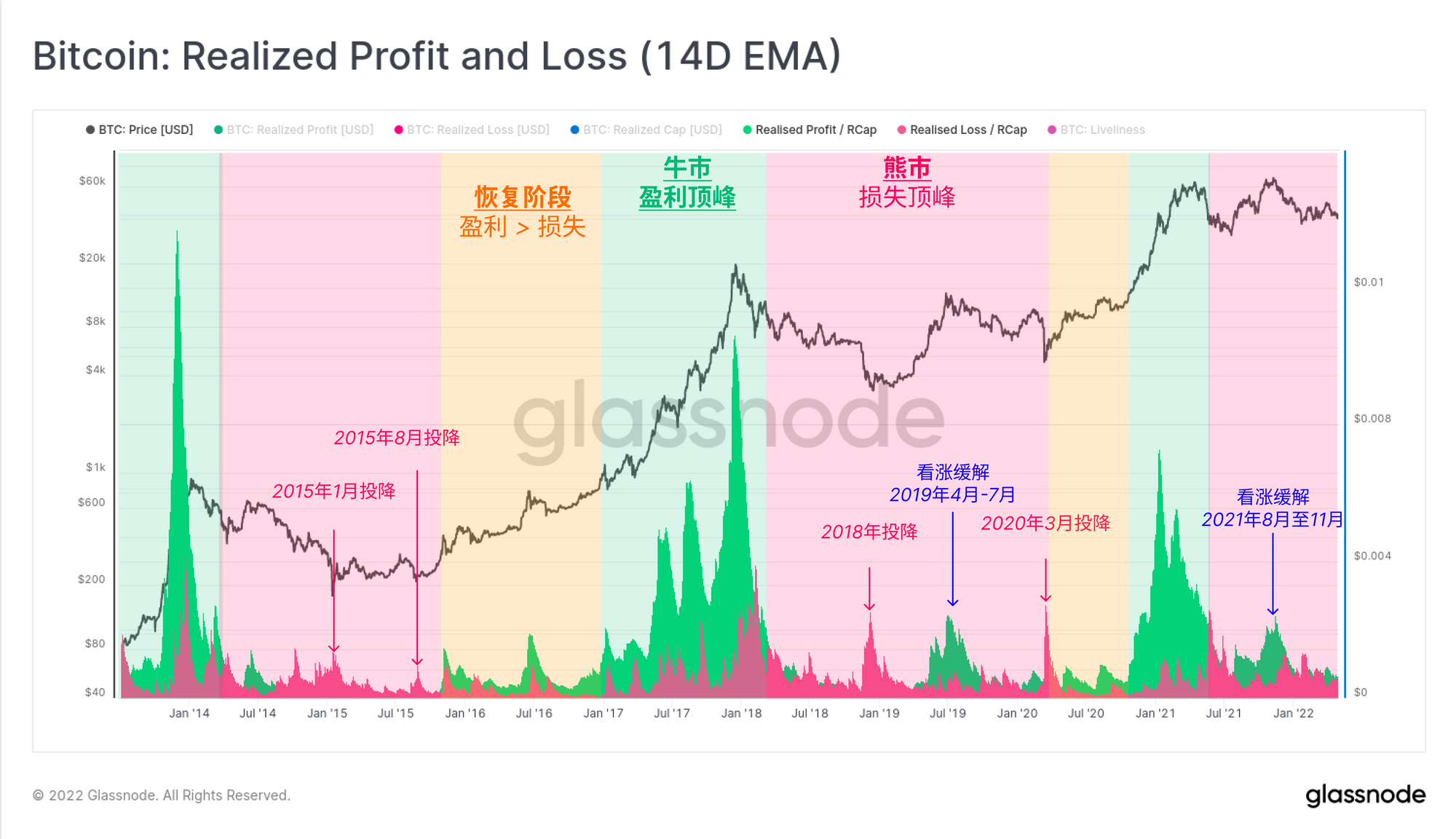 2. 熊市(红色区域),情况正好相反,价格下跌导致投资者损失处于主导地位(净资本流出)。2019年,也可以说是2021年末,我们观察到短暂的看涨反弹中投资者卖出获利。
