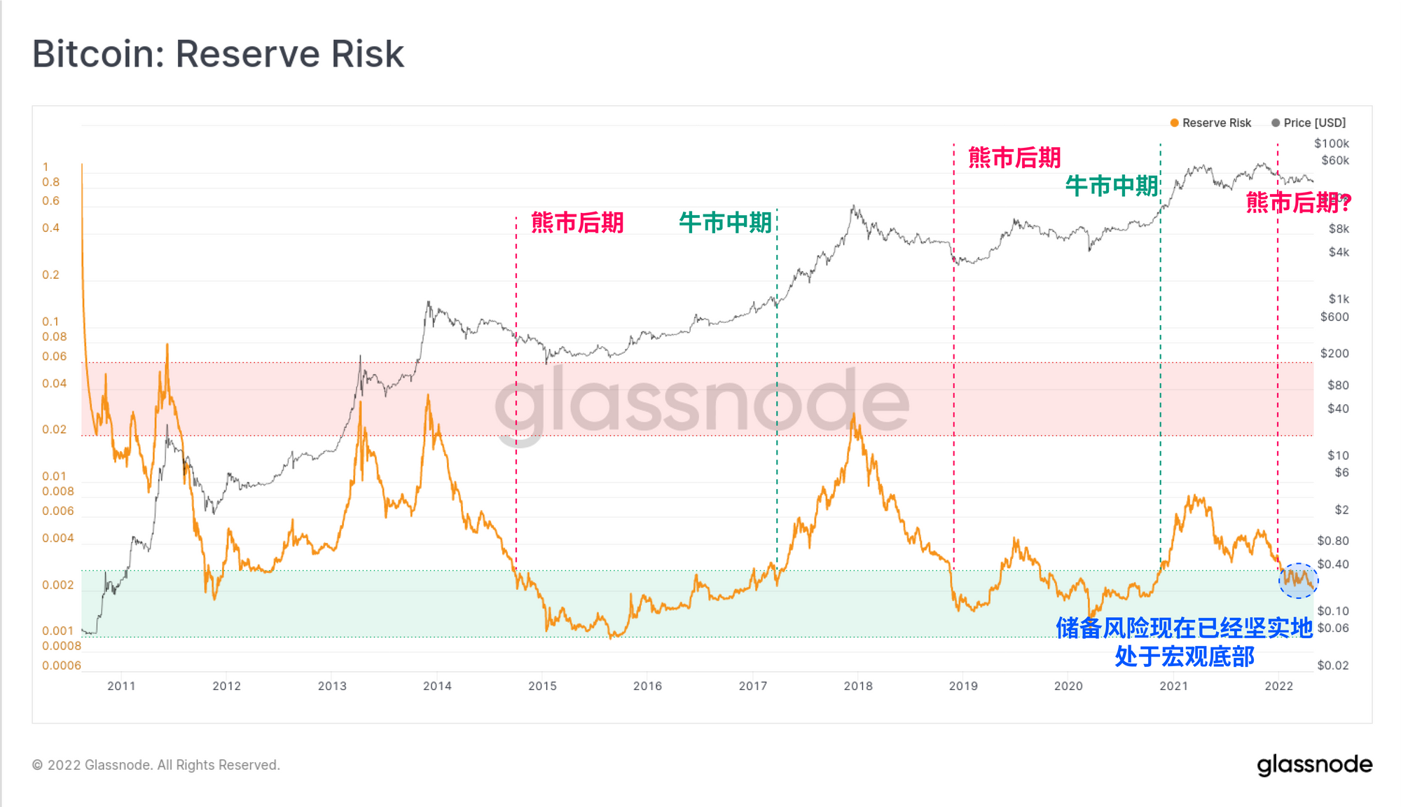 储备风险指标提供了另一个关于熊市底部的宏观证据,它是一个震荡指标,当积累和囤币成为首选时,这个指标被严重拖累(见我们的视频指南)。从历史上看,储备风险在熊市后期(底部形成前)曾跌破0.0025的门槛(绿色),并在随后的牛市中部分时间重新出现。