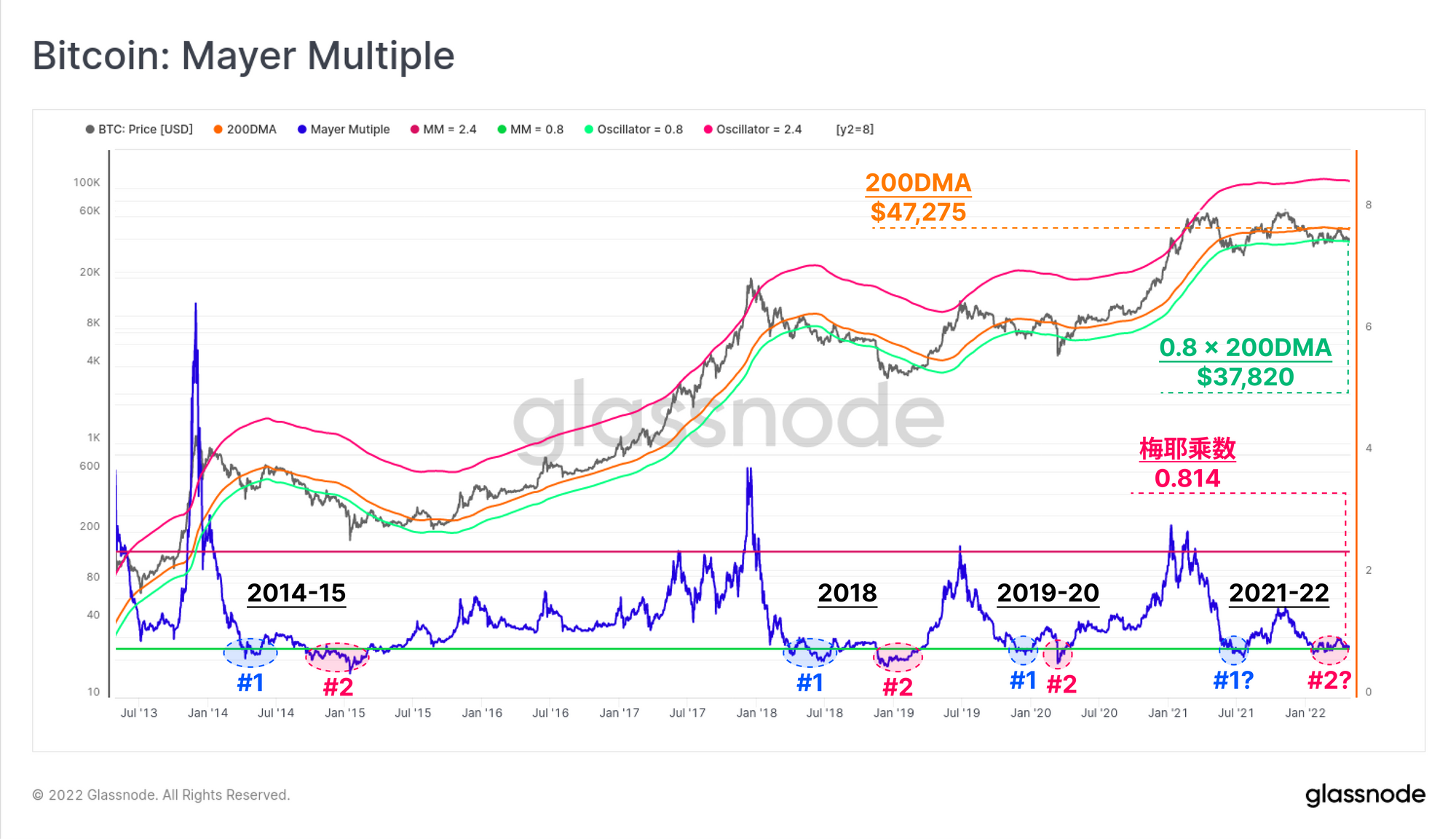 最知名的比特币指标之一,也是群众最喜欢的指标,是梅耶乘数。这个震荡指标为价格和200日移动平均之间的简单比率。尽管它很简单,但它为比特币周期提供了一个强大而可靠的长期底部和顶部形成指标。