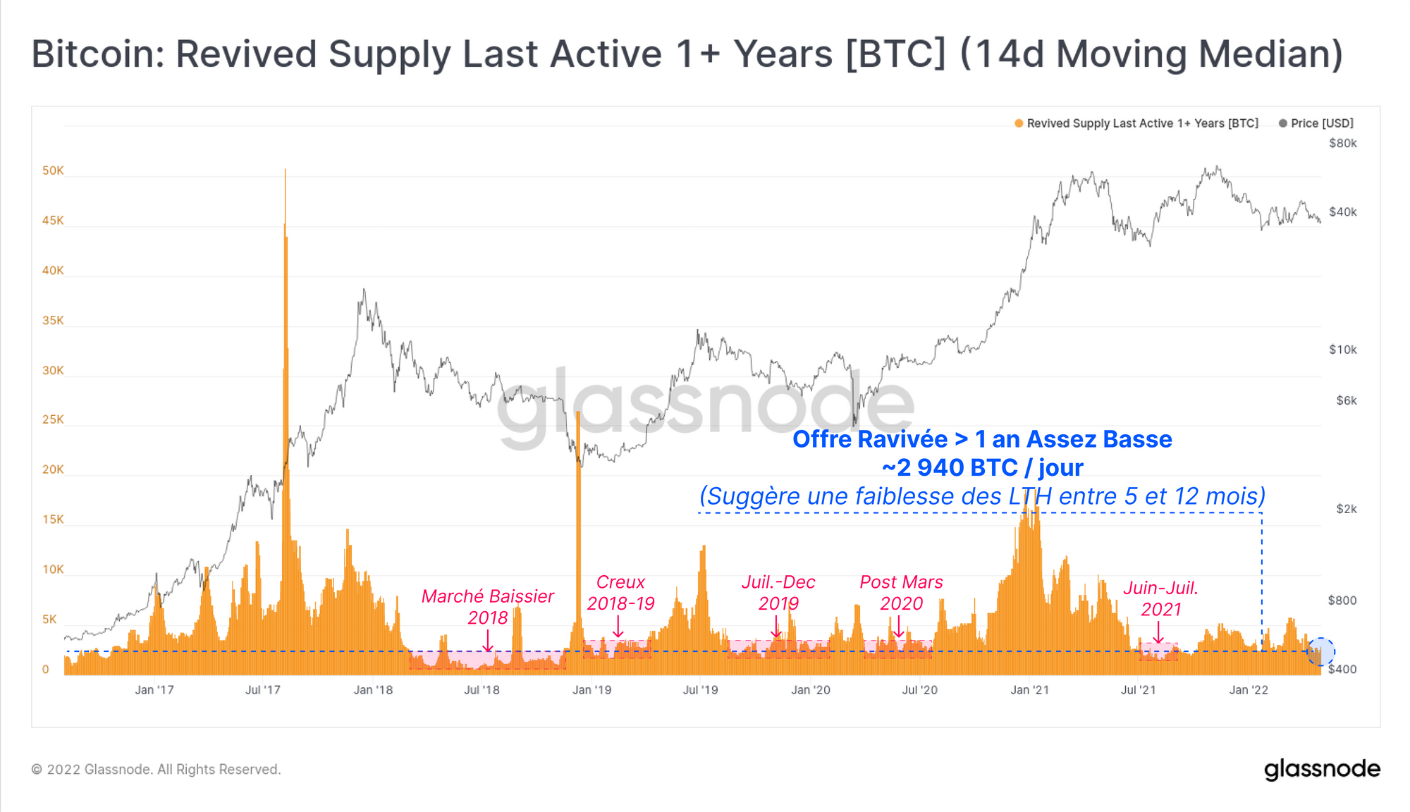 Ensuite, nous examinons l'offre ravivée âgée d'un an et plus, qui capte tous les volumes de BTC qui ont été achetés avant la capitulation de mai 2021. Ce que nous pouvons voir, c'est que cette métrique est en baisse et s'approche de niveaux relativement bas. Habituellement, les lectures très basses de l'offre ravivée se produisent lors de profonds marchés baissiers où l'accumulation est le comportement préféré des LTH.