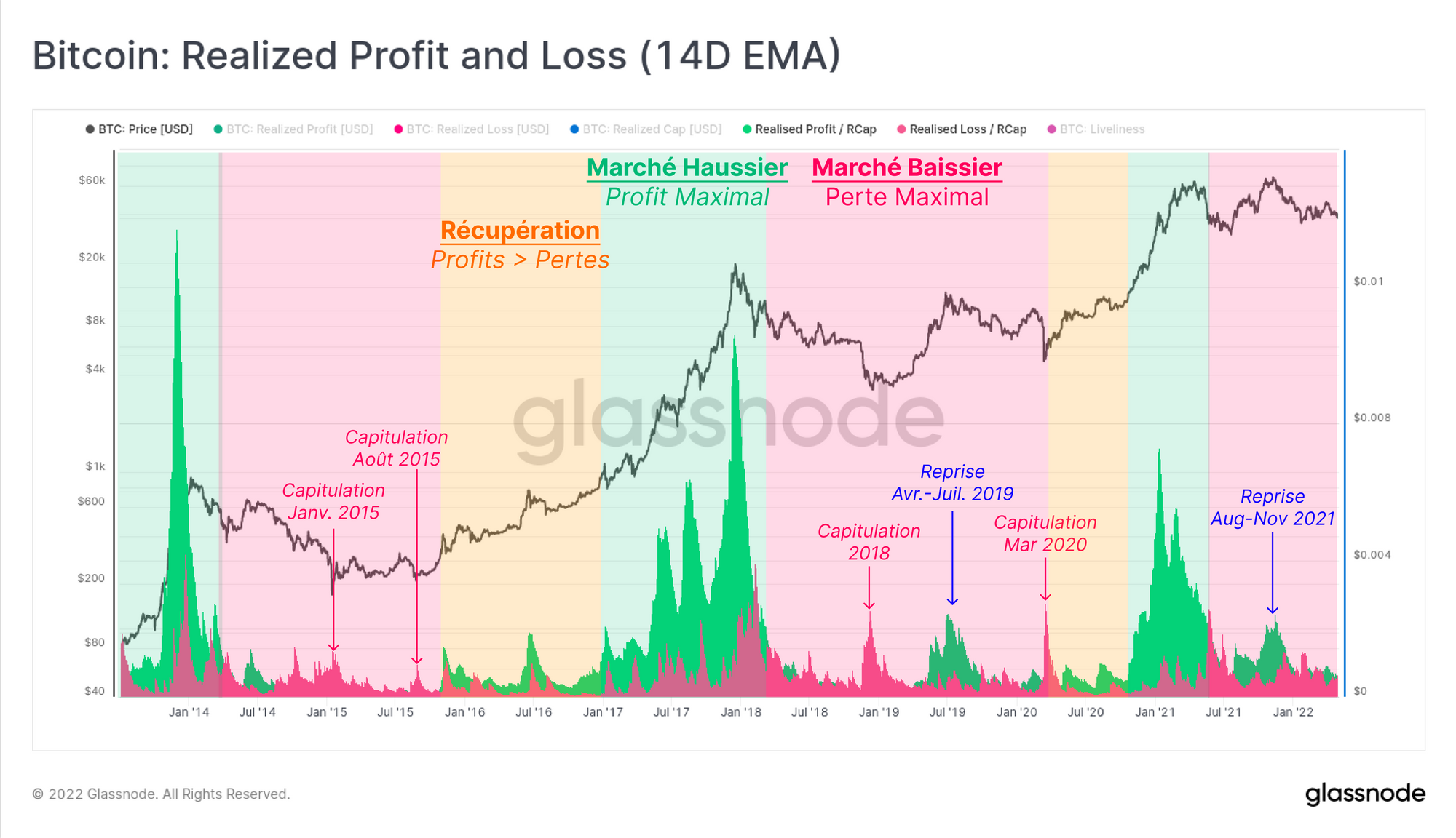 - Les marchés baissiers (zone rouge), où l'inverse est vrai, et où la baisse des prix entraîne une prédominance des pertes réalisées par les investisseurs (sorties nettes de capitaux). En 2019 et sans doute à la fin de 2021, nous avons assisté à des prises de bénéfices lors d'un bref retour haussier qui a finalement été vendu.
