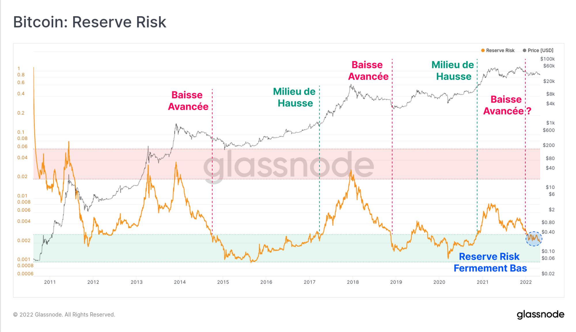 La métrique du risque de réserve fournit une autre vue macroéconomique des creux de marchés baissiers. C'est un oscillateur fortement pondéré par le moment où l'accumulation et le HODLing sont privilégiés (voir notre guide vidéo).