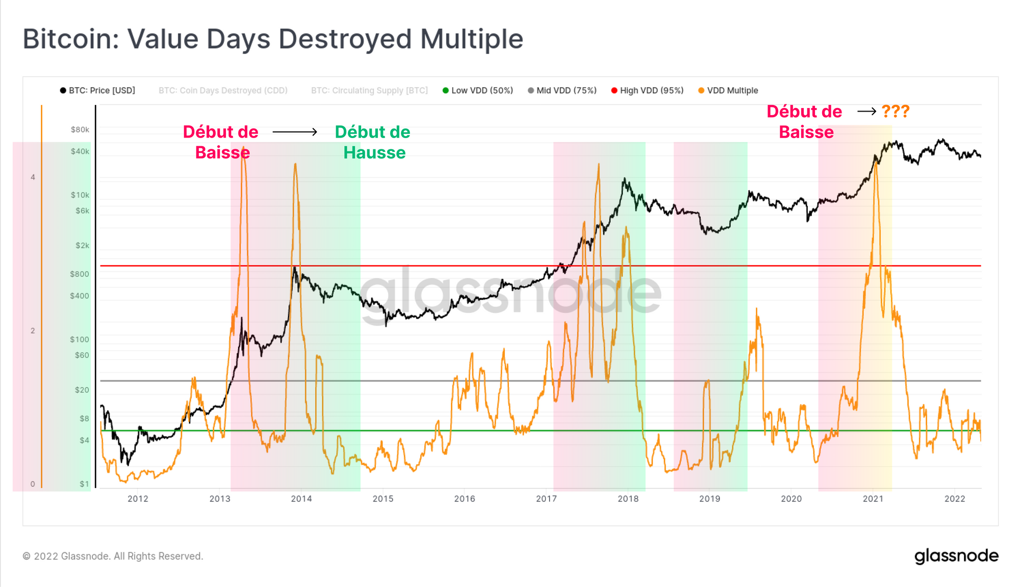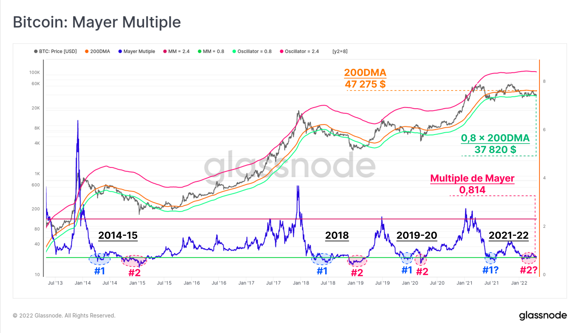 Les planchers des marchés baissiers des cycles passés sont généralement scindés en deux phases par rapport au niveau multiple 0,8, d'abord au début de la baisse (#1), puis à nouveau après un événement majeur de capitulation (#2). Le marché se situe actuellement juste au-dessus de ce niveau clé qui pourrait être considéré comme une partie de la phase n°2 du cycle 2021-22.