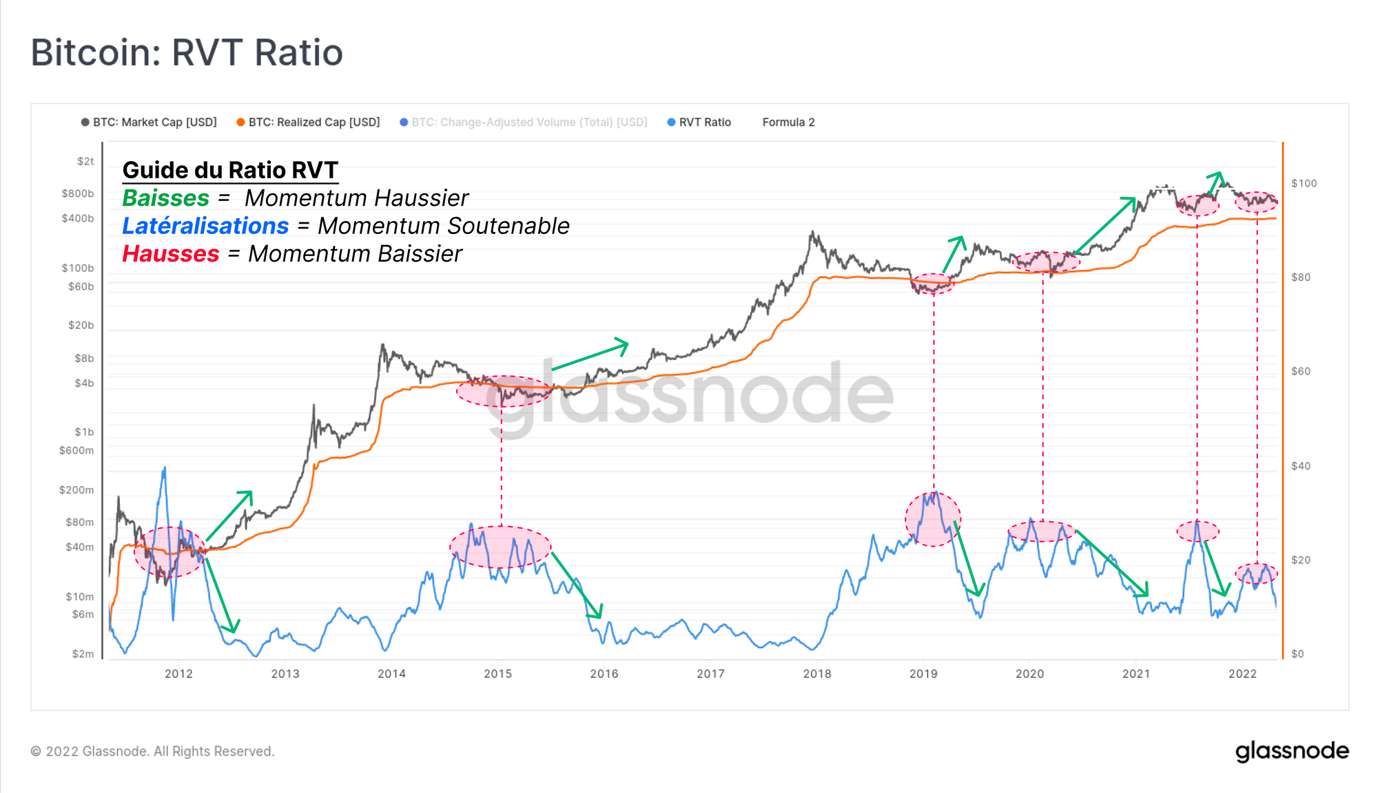 - Les tendances à la hausse et les valeurs élevées sont historiquement baissières, signalant que les volumes de transactions (et donc l'utilisation du réseau) sont en baisse par rapport à la valorisation de la chaîne (surévaluée). Les points bas des marchés baissiers sont généralement établis à RVT > 30, et confirmés par un retournement de tendance à la baisse.