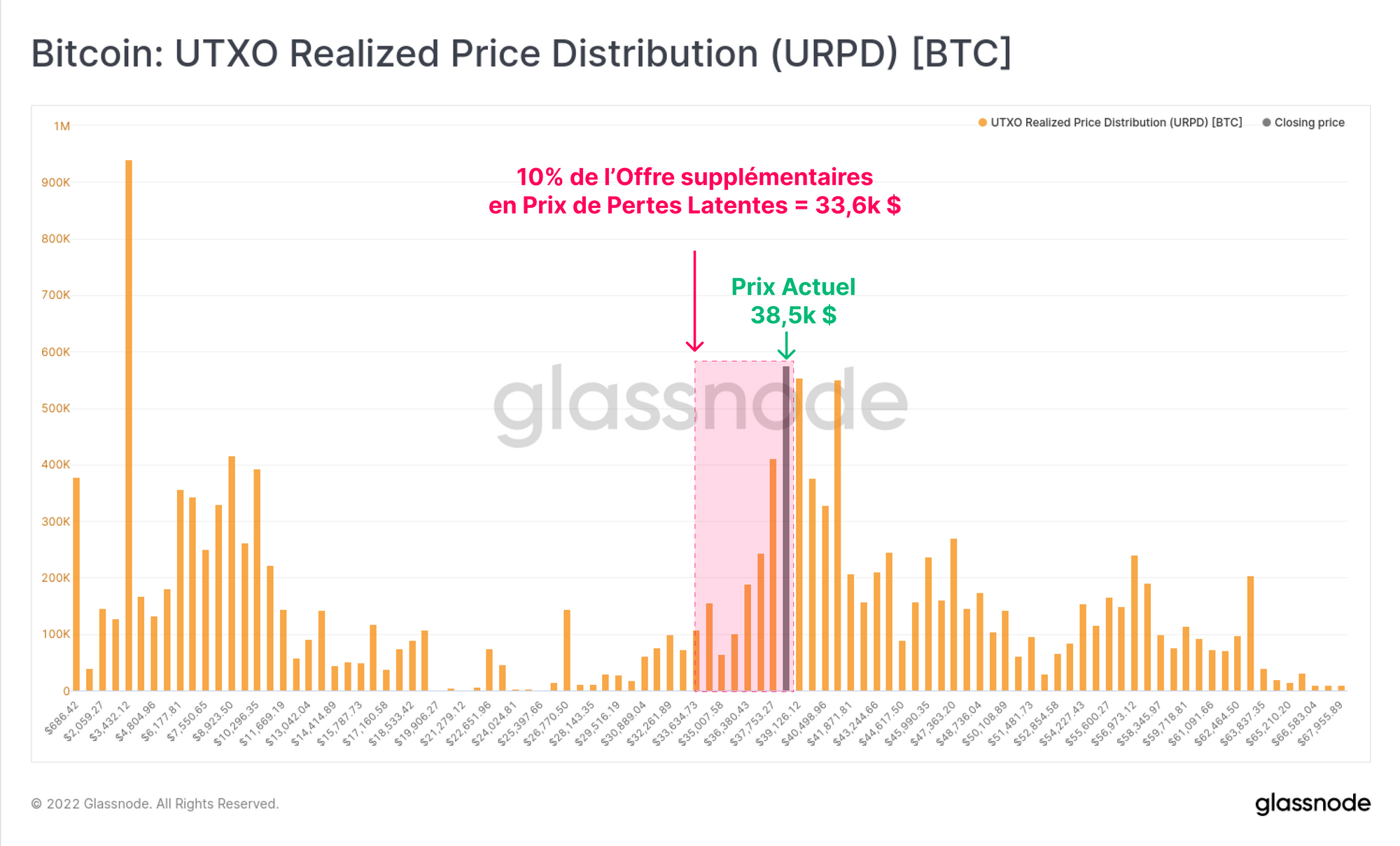 Les prix s'échangeant à 38,5k $ à l'heure où nous écrivons ces lignes, le marché devrait tomber à 33,6k $ dollars pour plonger 1,9 million de BTC supplémentaires (10 % de l'offre) dans une perte non réalisée.