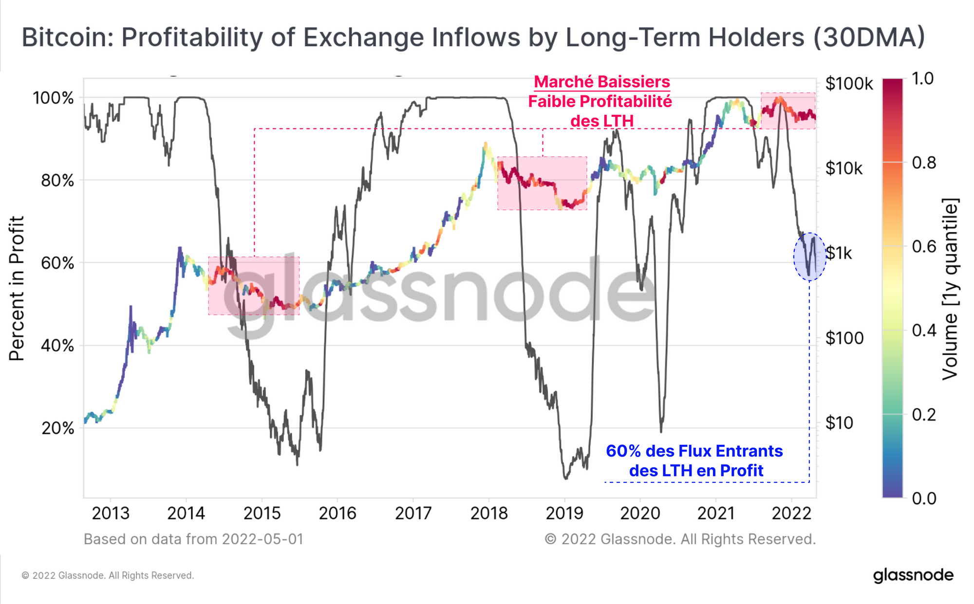 - L'Oscillateur (gris, 30DMA) montrant la proportion du volume de BTC en profit envoyé aux échanges par LTH. Nous pouvons voir qu'il a diminué de manière significative depuis septembre 2021, et qu'il oscille maintenant autour de 60 % (ce qui ajoute du poids à notre estimation précédente du seuil de douleur).